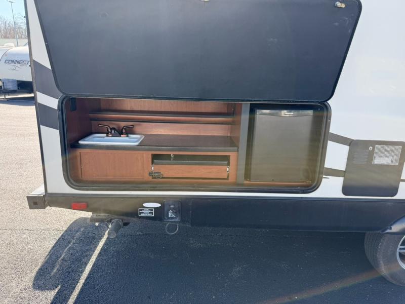 On the outside you will love the rear exterior pull-out kitchen which features a refrigerator, pull-out cook-top, counter space and more. There is also a front pass-through compartment for all of your outdoor camping gear too.