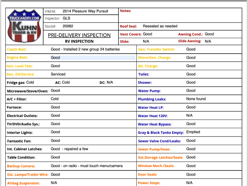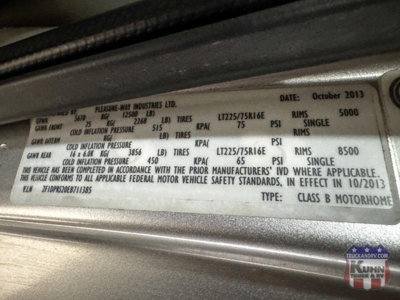 2014 Pleasure-Way Pursuit - 22'2" bumper to bumper - 5.4L V8 Triton gas engine - Ford E350 chassis - Fully Self Contained - 11' power awning - Tow package - 2 burner LP cooktop - Microwave/convection oven - 6 NEW TIRES - 2 seat belts - Onan 4K gas generator with 110 hours - Rooftop A/C - LP furnace - Flat screen TV w/ DVD player - Holding tanks - In the cabin area there are power windows, locks, mirrors, tilt, and cruise - The radio has Bluetooth and is satellite radio ready - This Pleasure-Way Pursuit is a hard to find floorplan that is ready for your next adventure!