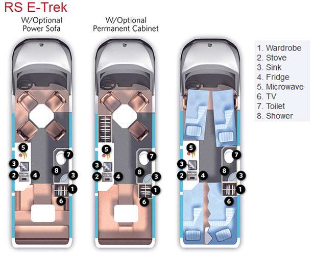 E Trek Motor Home, Table Which Converts to Twin Beds, Sink, Range, Rear Dinette Converts to Bed, Wardrobe, Lav., Toilet & Much More.