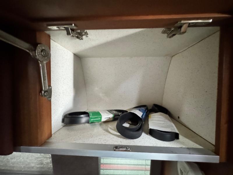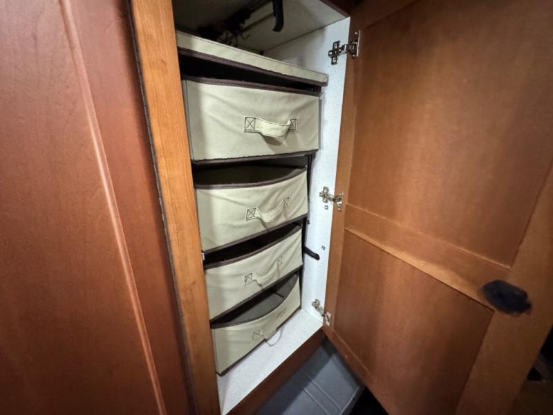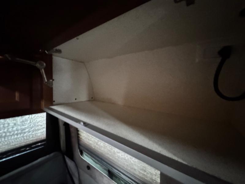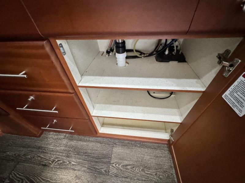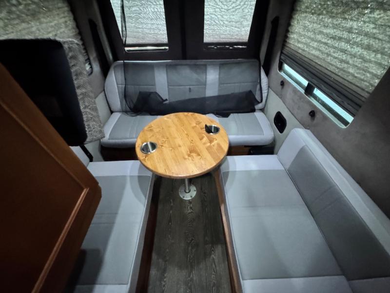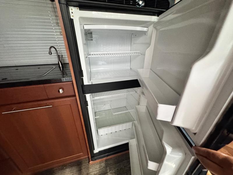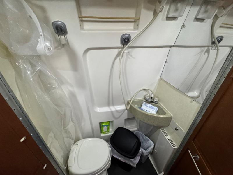 The living area includes three deluxe captain’s seats with a pedestal table for dining or working, and a rear power sofa that effortlessly converts into a king-size bed or two twin beds for flexible sleeping arrangements. An optional folding mattress allows the passenger-side captain’s chairs to transform into additional sleeping space. The permanent bathroom maximizes space with a toilet, sink, slide-out counter, mirror, and a sit-down or stand-up shower, ensuring comfort on the road.