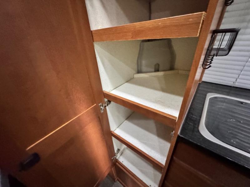 The CS Adventurous features a sleek, aerodynamic design with flush exterior walls and a large windshield for enhanced visibility and reduced drag. Its interior is thoughtfully crafted to maximize comfort and versatility, boasting a spacious galley with a 7.5 cu. ft. refrigerator/freezer, a two-burner propane stove, a convection microwave, and a Paperstone countertop made from eco-friendly recycled materials. Ample storage is provided above and below the counter, including a tall pantry for added convenience.