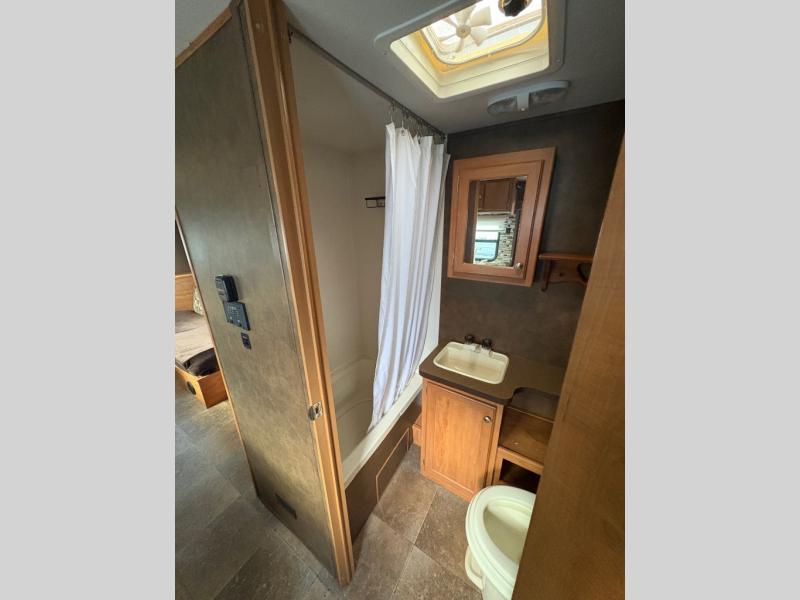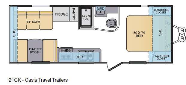 Oasis Travel Trailer by Shasta w/Rear Booth Dinette, 64" Sofa, Overhead Storage Cabinet, Refrig., Pantry, 3 Burner Cooktop, Dbl. Kitchen Sink, Side Aisle Bath w/24x36 Tub/Shower, Toilet & Vanity w/Sink, Front 50x74 Bed w/Wardrobe Closets Both Sides and Overhead Storage Plus More!