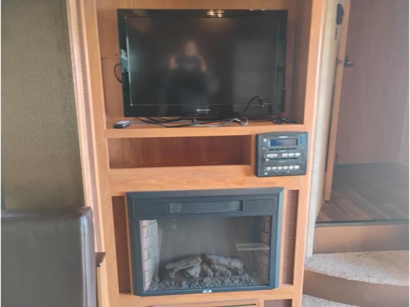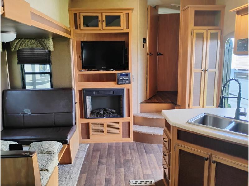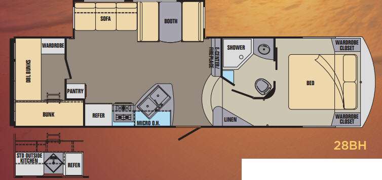 Step inside model 28BH and notice first the spaciousness created when the slide out sofa and booth dinette are fully extended. There is an entertainment center nearby just beyond the steps up front that can easily be viewed from any seating in the room. You can choose to add an optional 32" TV with optional fireplace below.