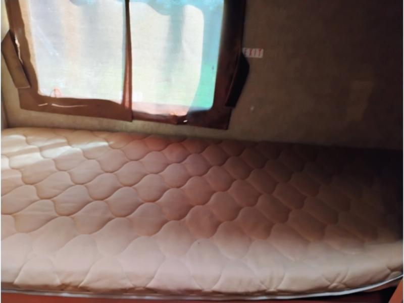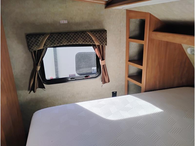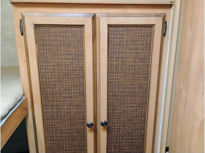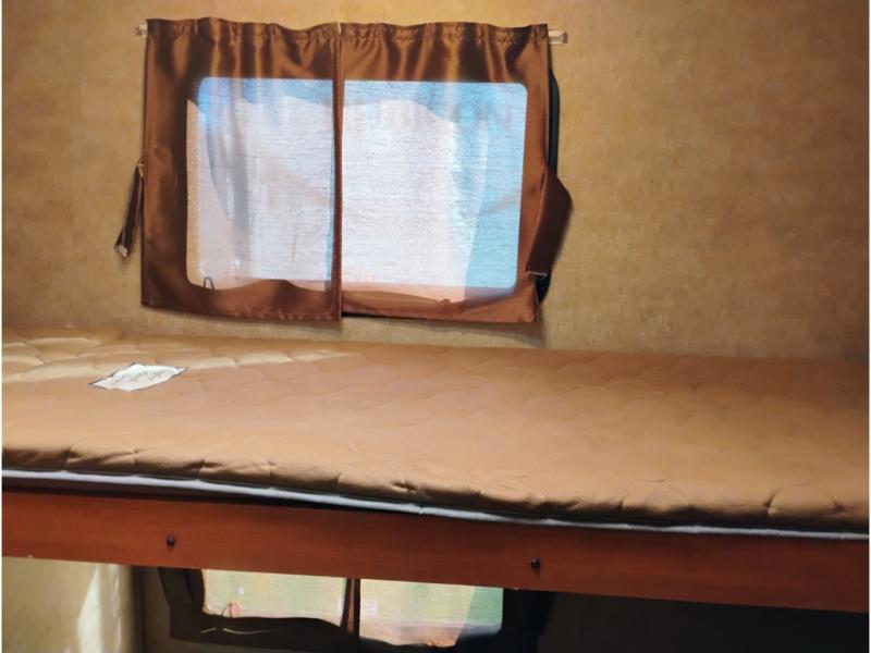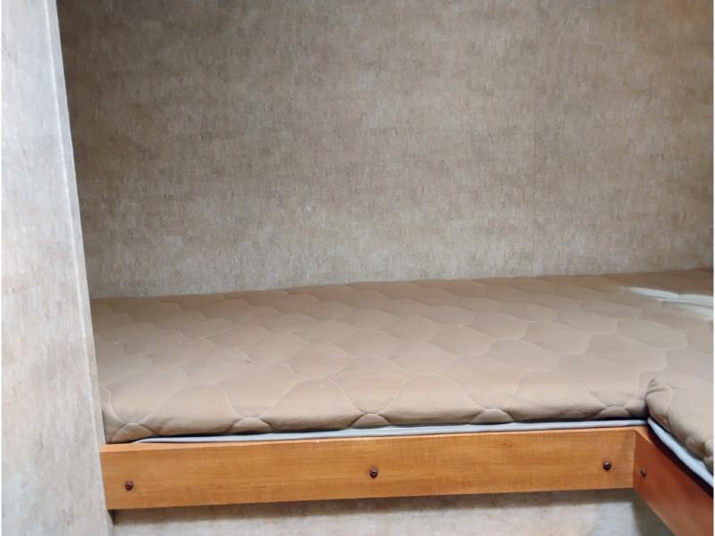 The rear private bunkhouse features quad bunks with one set along the rear wall, and another along the curbside wall with a wardrobe for clothing storage to the right of the door as you step inside.