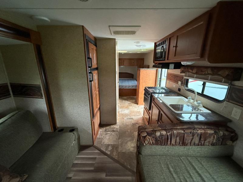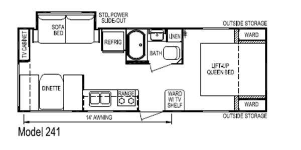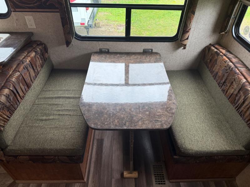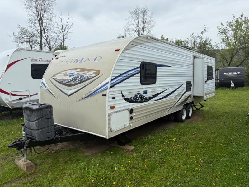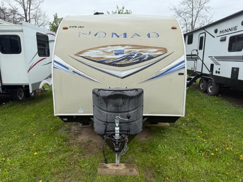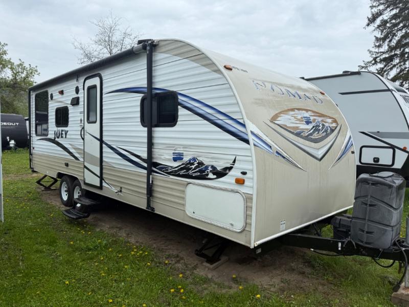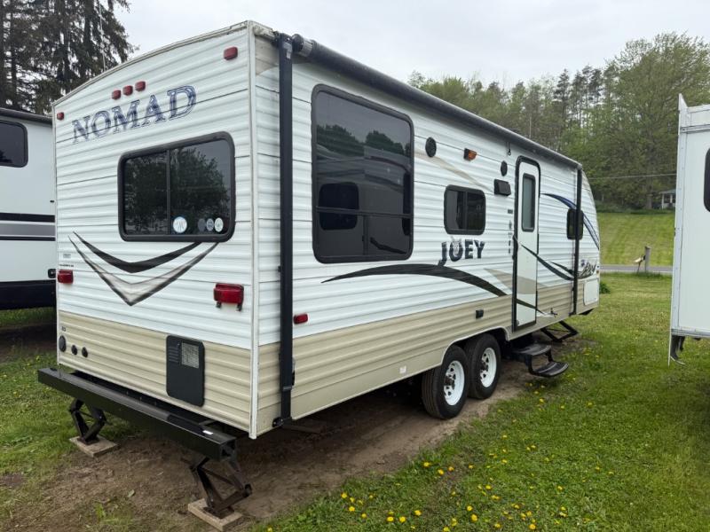 Single Slide Nomad Joey Select Travel Trailer, Rear Dinette, Double Kitchen Sink, 2-Burner Range, Ward. w/TV Shelf, Queen Bed, Double Wardrobes, Shower, Lav., Linen, Toilet, Refrigerator, Sofa Slide, TV Cabinet, Overhead Cabinets Throughout, Outside Storage, 14' Awning & Much More.
