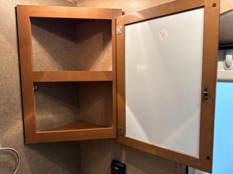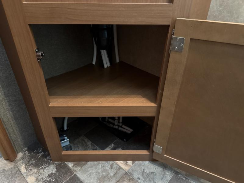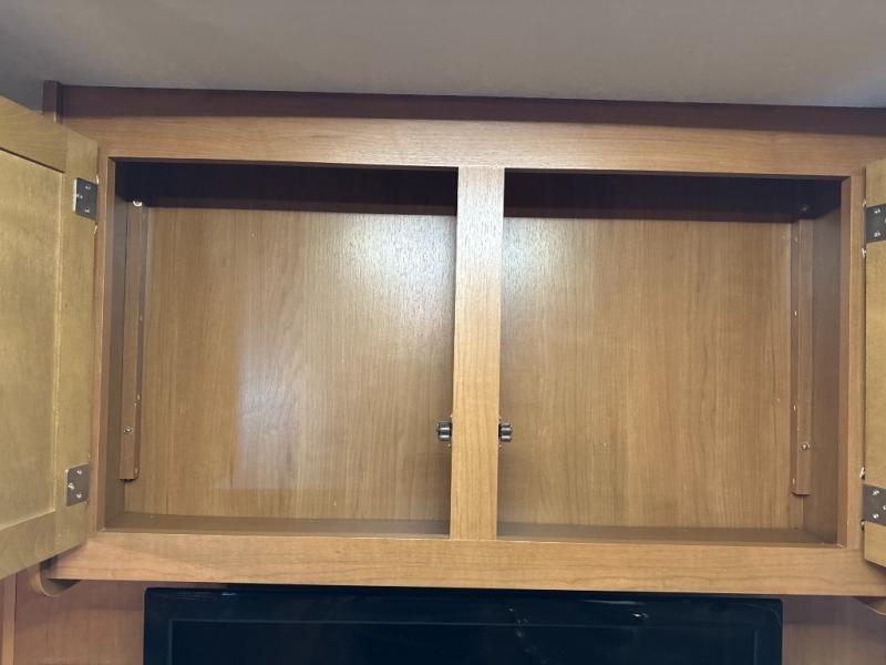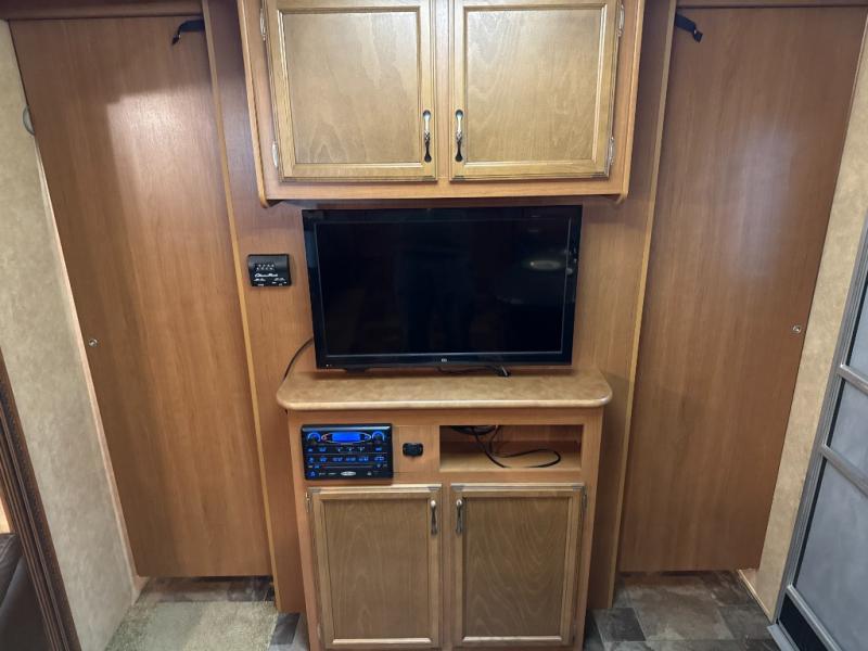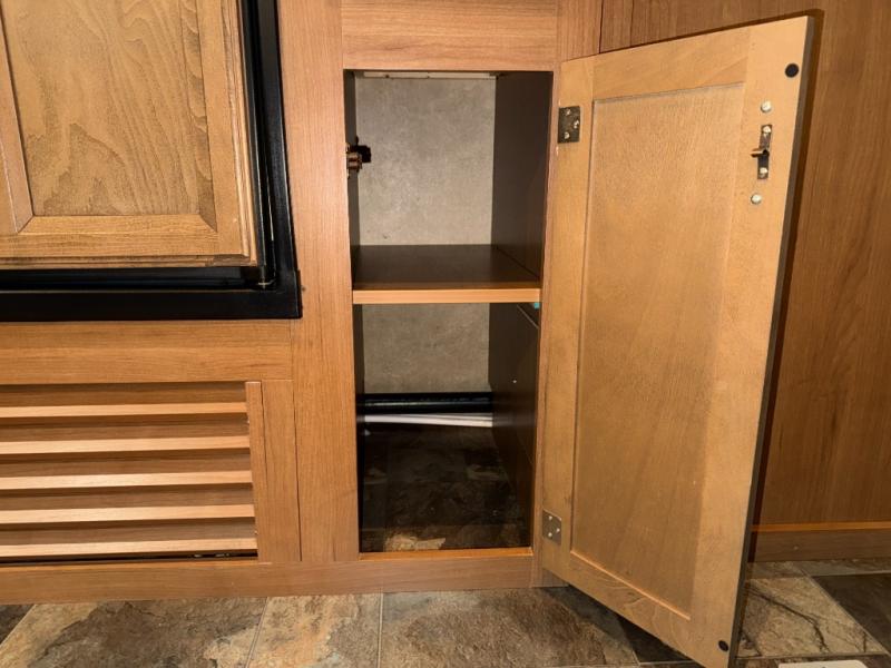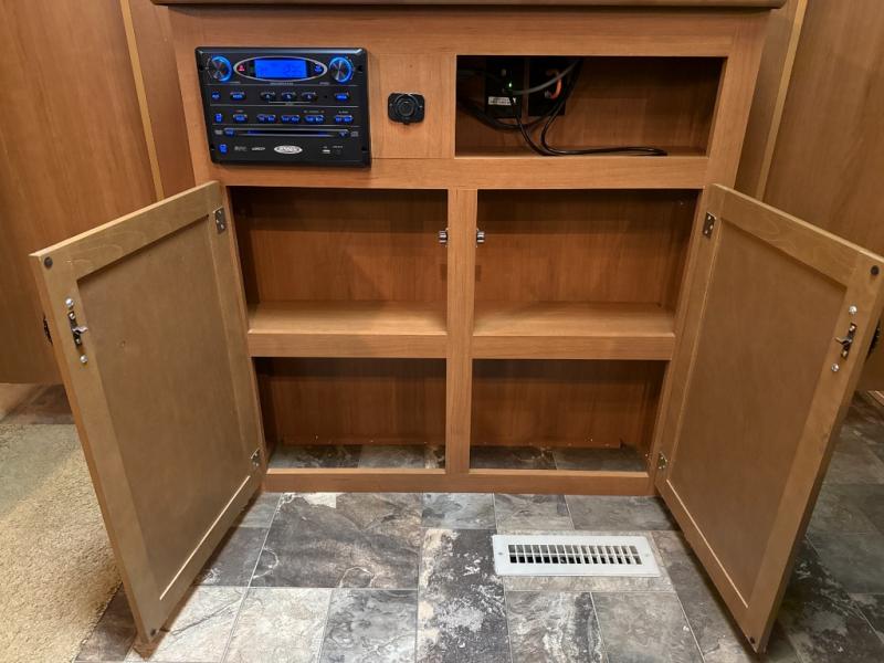 Straight ahead inside the door find a entertainment center for your enjoyment with storage both above and below. The entertainment center can easily be viewed by the u-shaped dinette and sleeper sofa slide opposite the door side.