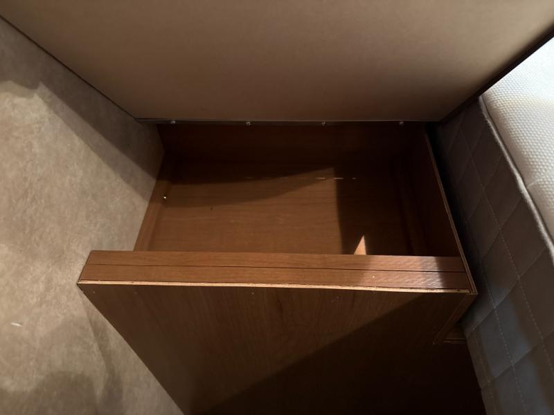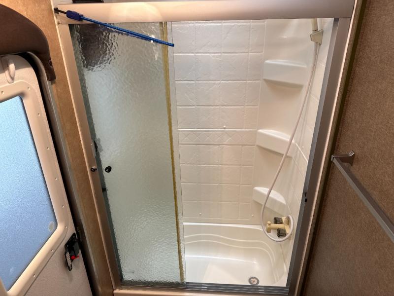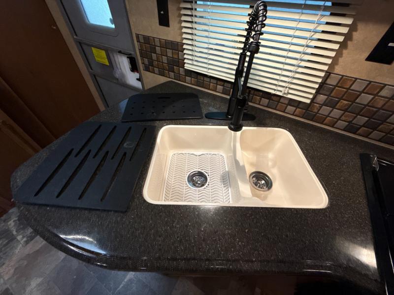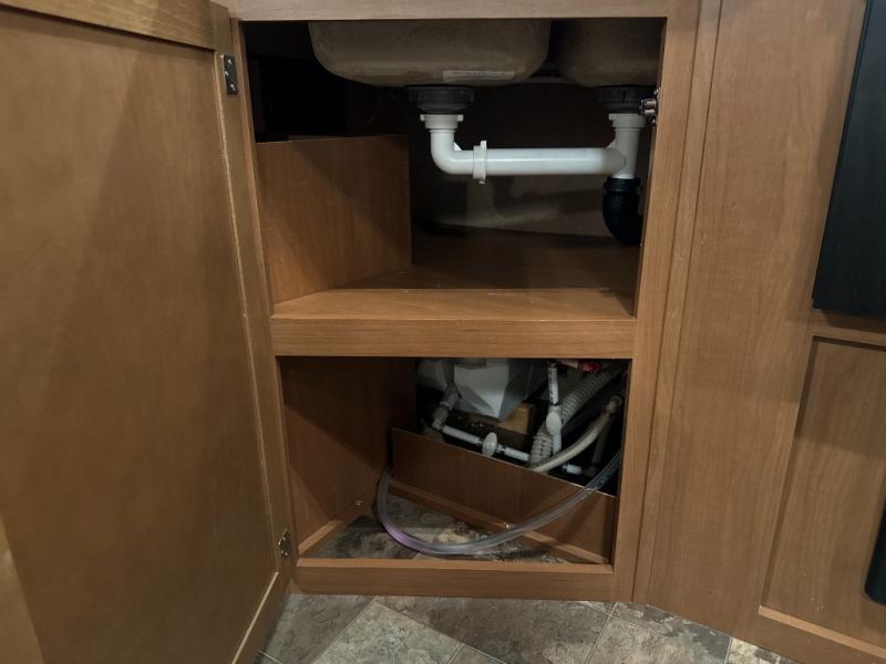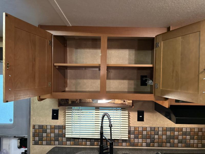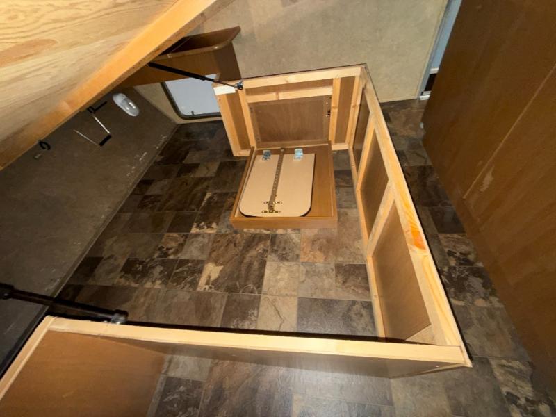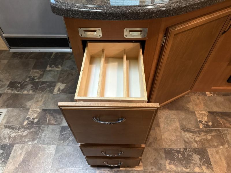 Straight ahead inside the door find a entertainment center for your enjoyment with storage both above and below. The entertainment center can easily be viewed by the u-shaped dinette and sleeper sofa slide opposite the door side.