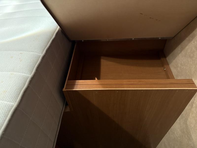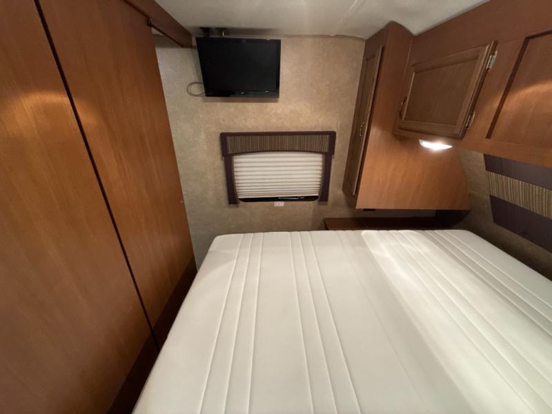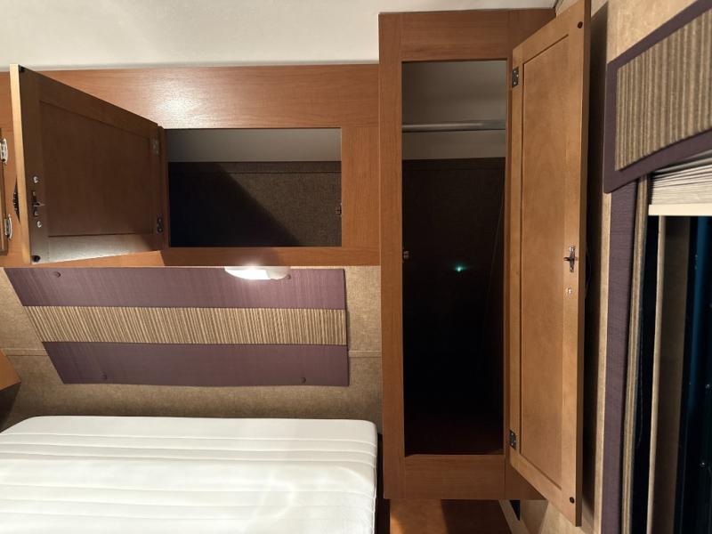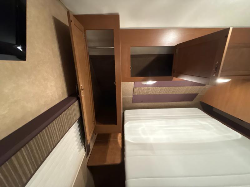 Step inside the entrance closest to the front and see a queen bed to the right. There are dual wardrobes and an overhead cabinet for storage.