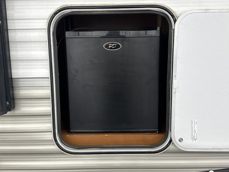 An outdoor refrigerator is perfect for accessing drinks while outside. There is also an 18' awning and exterior storage access up front on both sides of the trailer, and so much more!