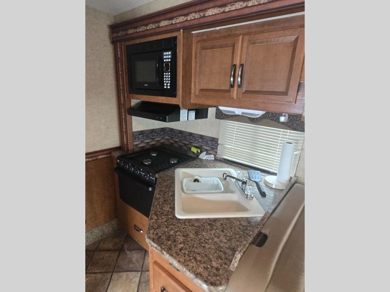 Across from the entry door is a booth dinette, large single sink, and three burner range-top with microwave oven above. The slide creates a roomy interior with plenty of space for everyone to move around. Both the sofa and dinette can easily be made into more sleeping space when needed. There is also a refrigerator located just off the slide next to the range.