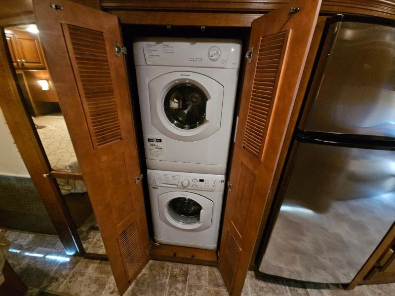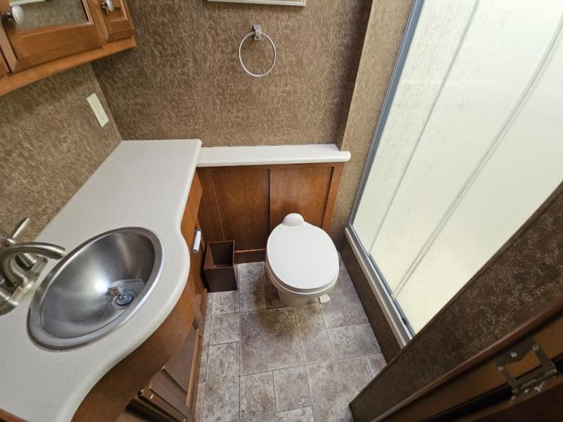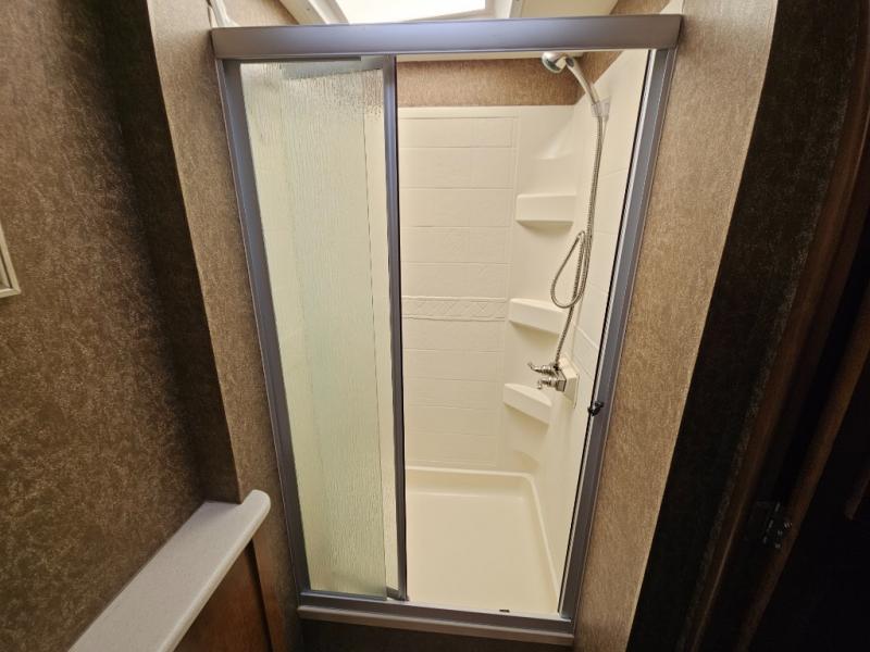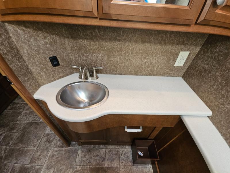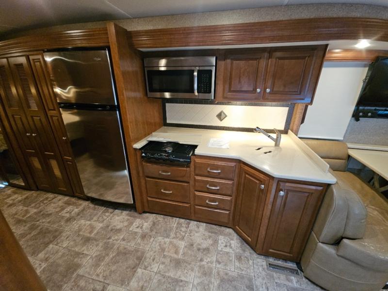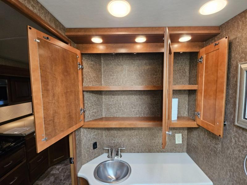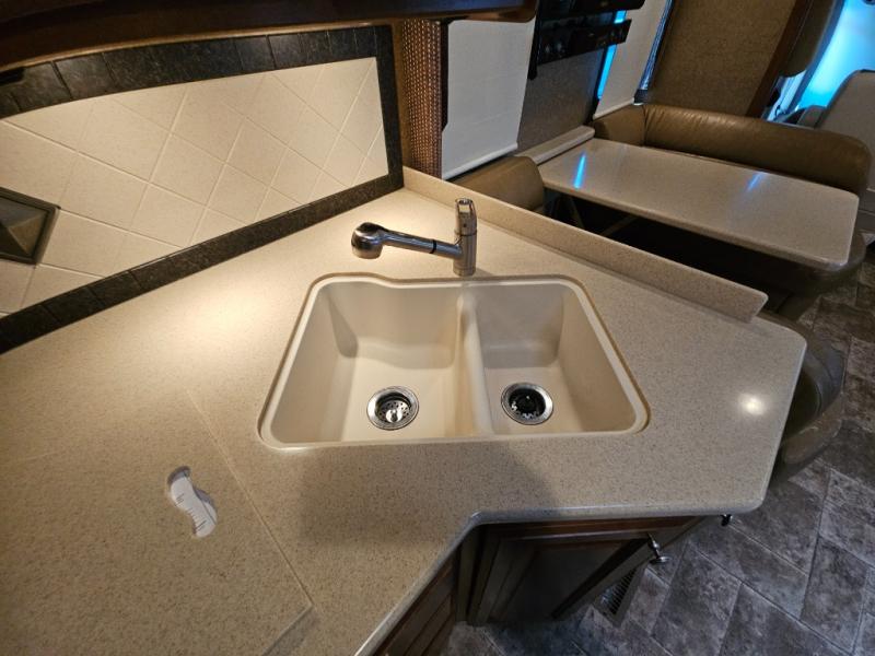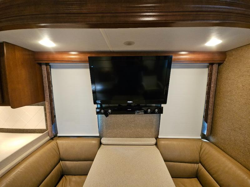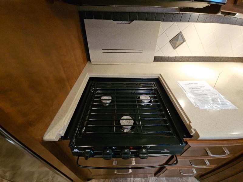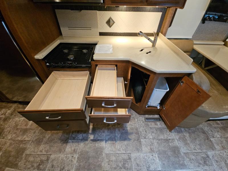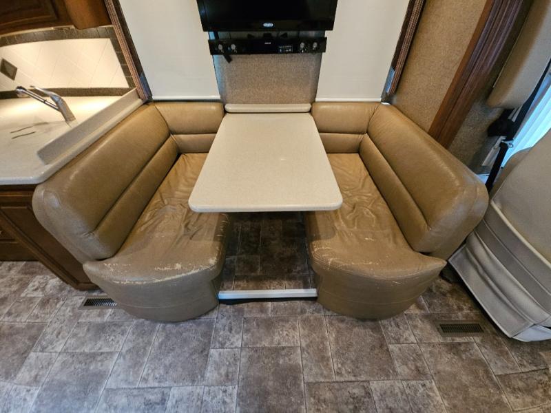 Along the road side, a generous slide out houses a dream dinette booth with a 32" TV mounted above it. There is also an angled double bowl sink, three burner range, overhead cabinets, a refrigerator, pantry, optional washer/dryer and a closet.