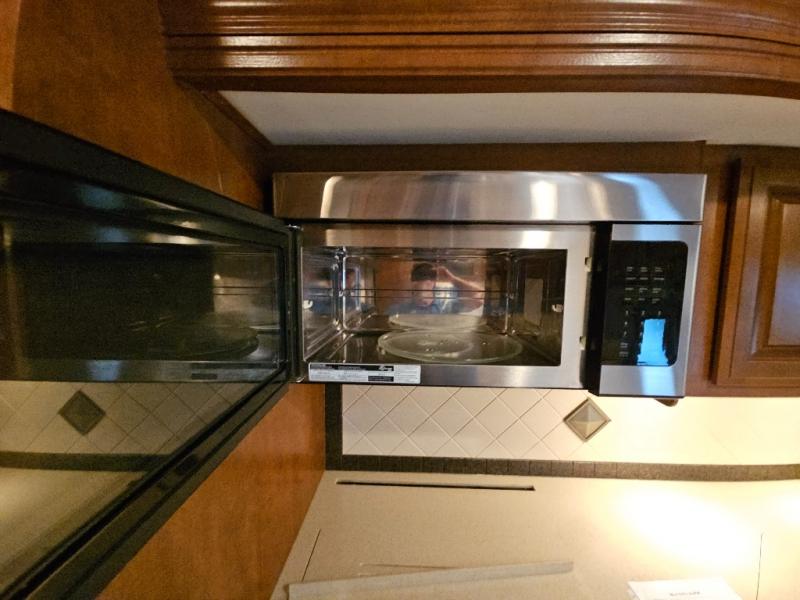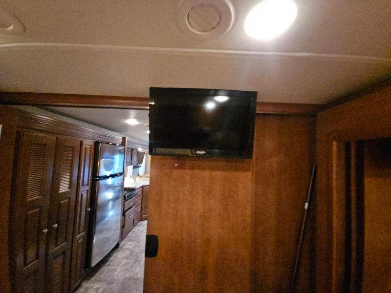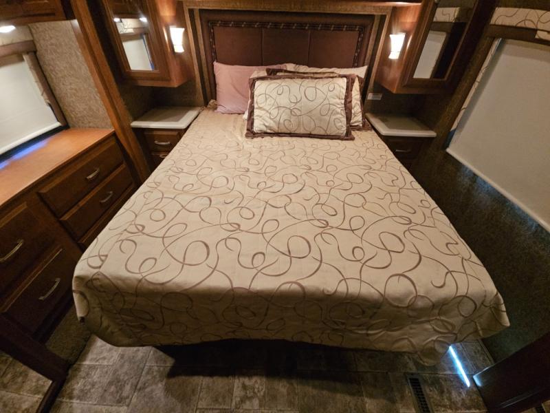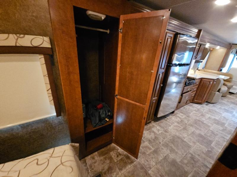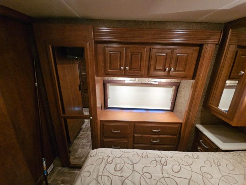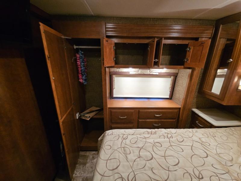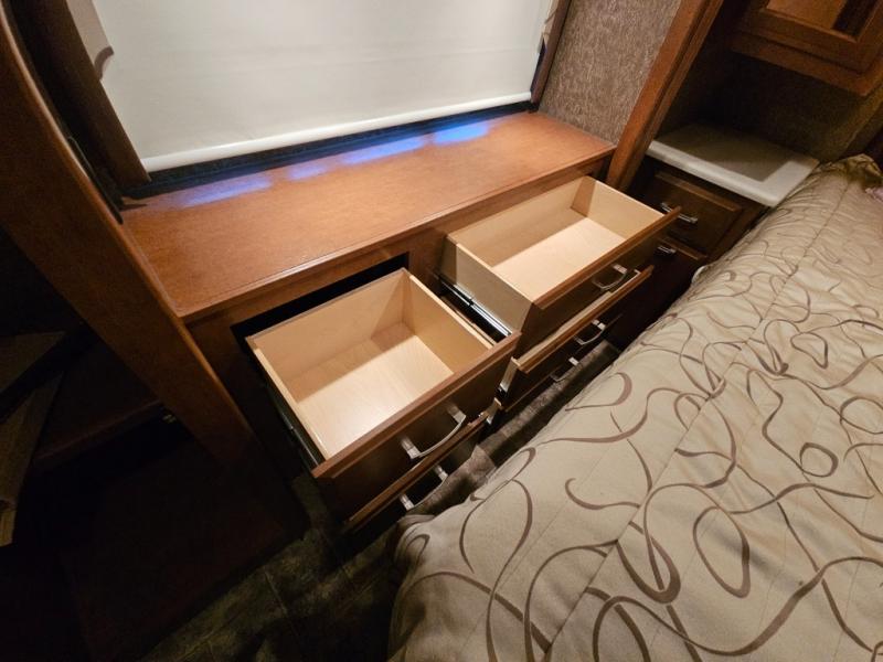 The rear bedroom includes a queen bed with closets at each side and overhead cabinets. The closet within the generous slide is in the bedroom. A slide out on the opposite wall holds a dresser and another closet. A 29" TV is on the wall opposite the bed.