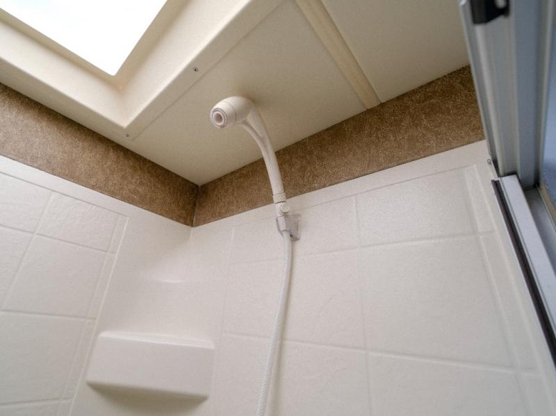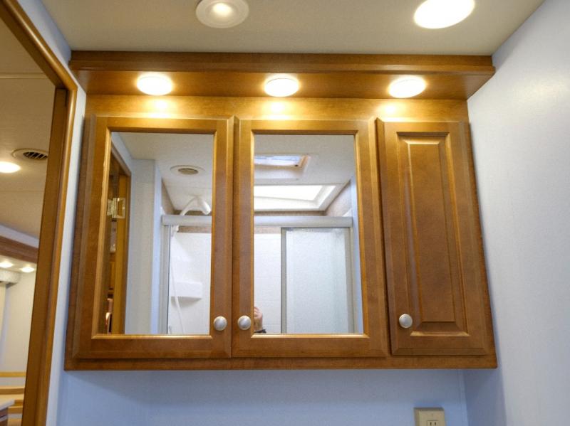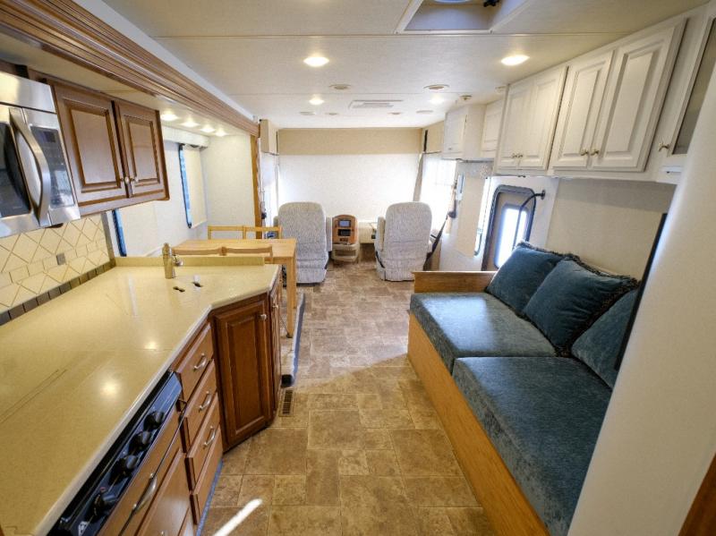 A 68" side sleeper sofa with overhead cabinets is along the curb side, just before the entry door.