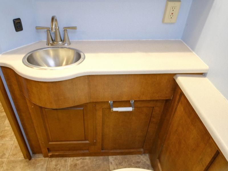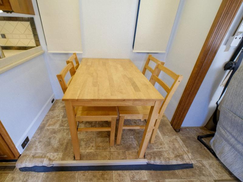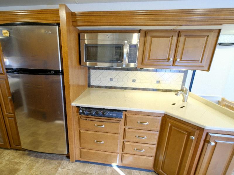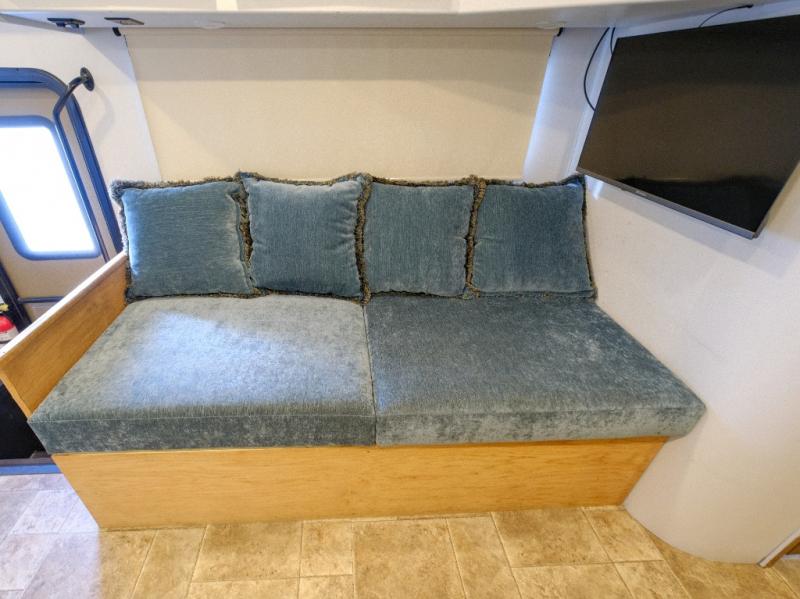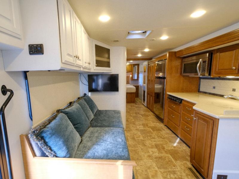 Along the road side, a generous slide out houses a dream dinette booth with a 32" TV mounted above it. There is also an angled double bowl sink, three burner range, overhead cabinets, a refrigerator and pantry.