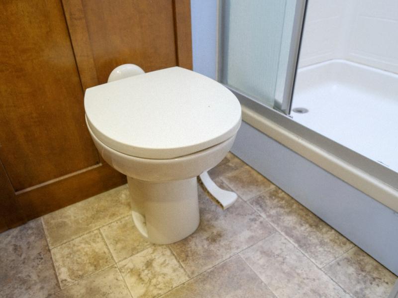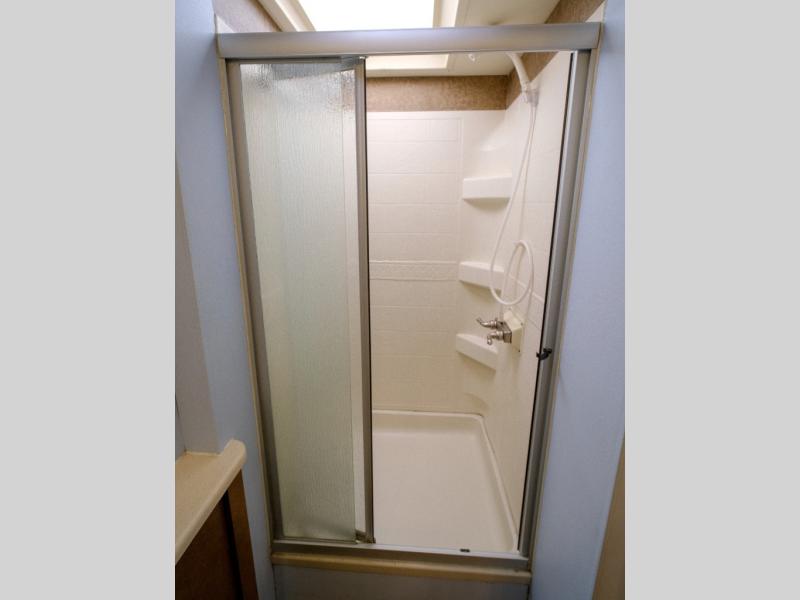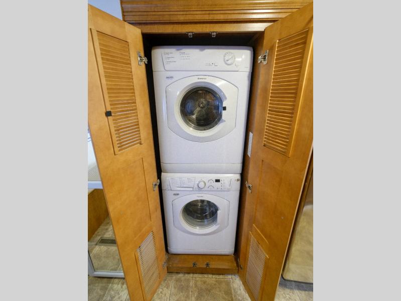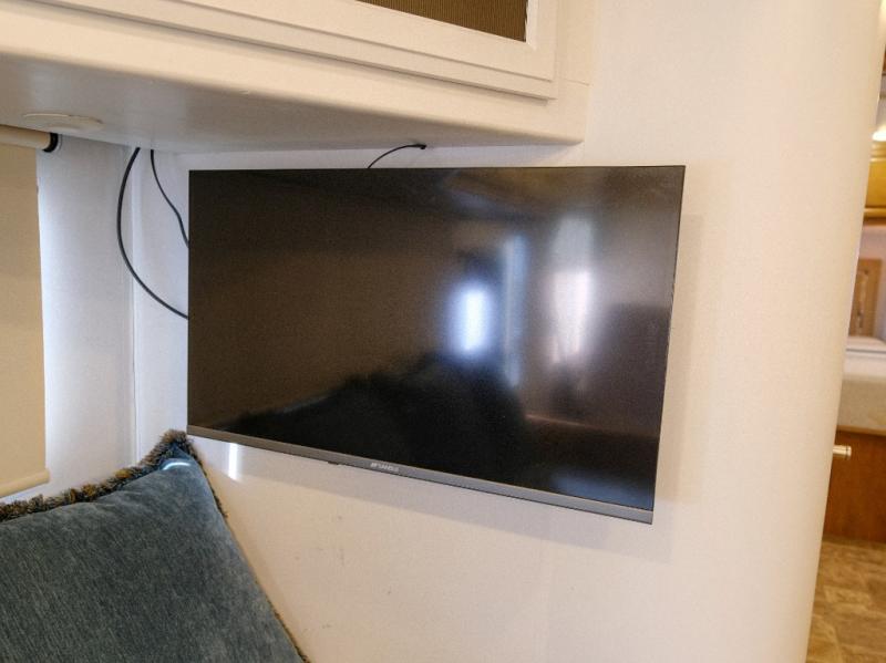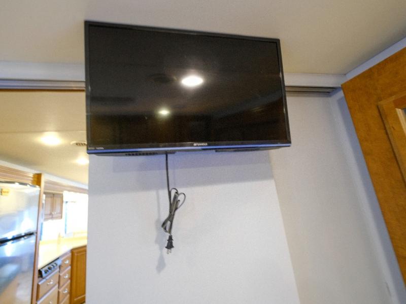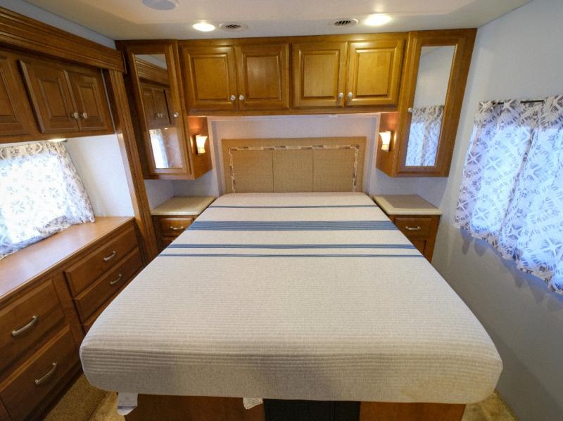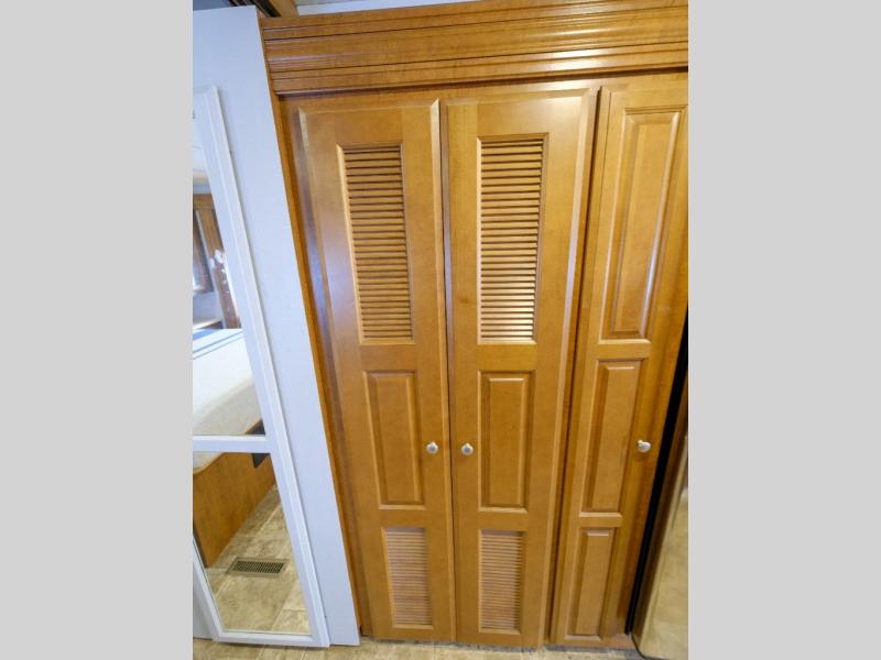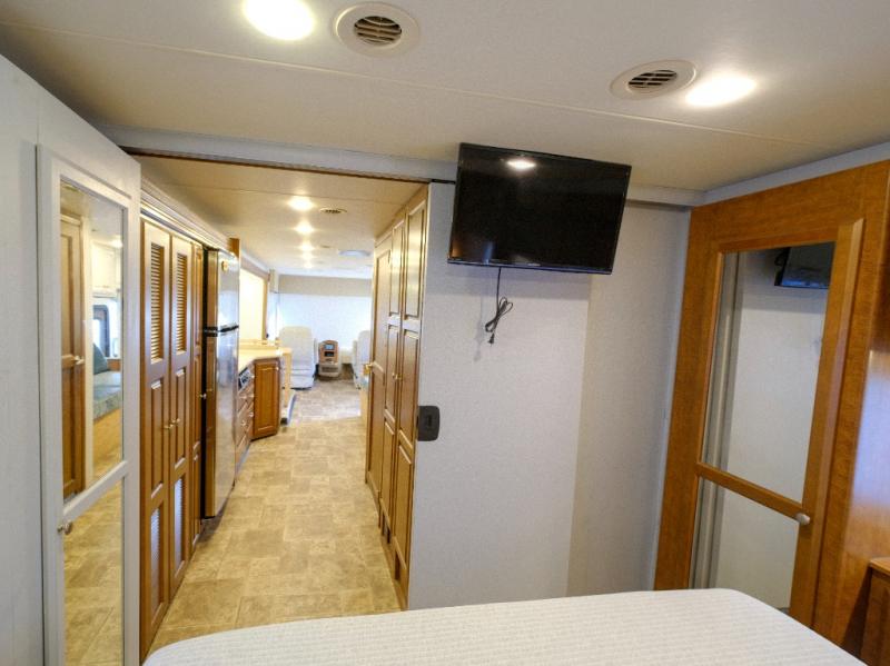 The rear bedroom includes a queen bed with closets at each side and overhead cabinets. The closet within the generous slide is in the bedroom. A slide out on the opposite wall holds a dresser and another closet. A 29" TV is on the wall opposite the bed.