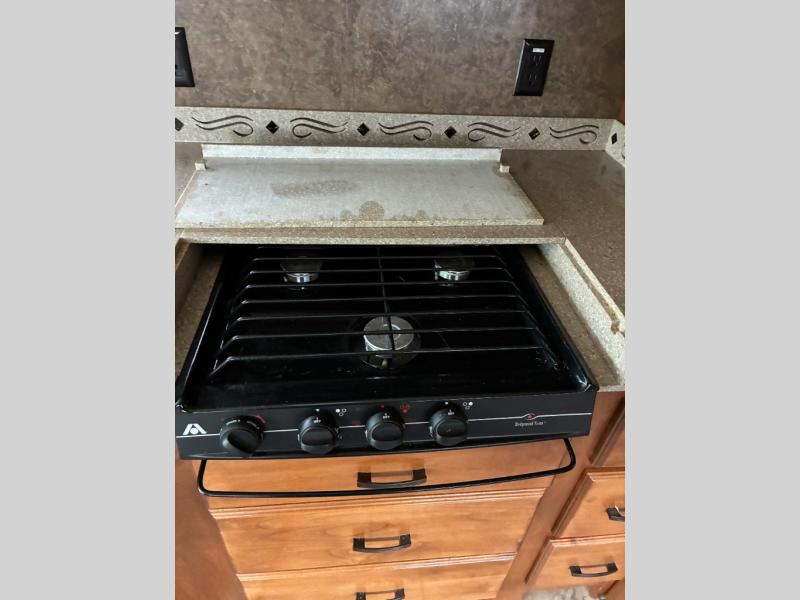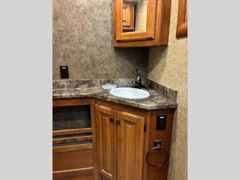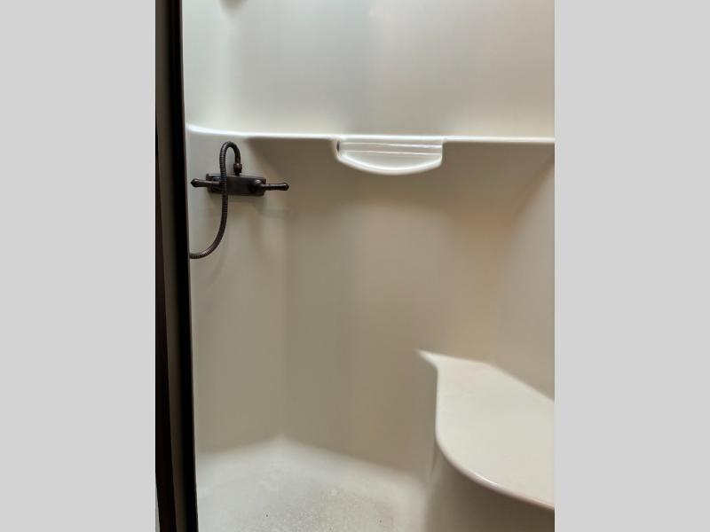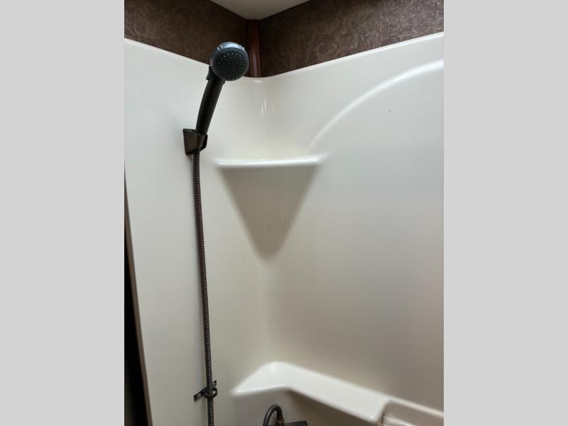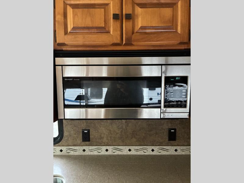 The living/dining slide houses a booth dinette and a chaise sofa bed with coffee table as well as overhead cabinets. You may choose a dinette with computer workstation and/or a recliner with ottoman and sofa/sleeper. A TV is mounted on the opposite wall for easy viewing from all of the seating. You many choose an optional fireplace below the TV in the entertainment center.