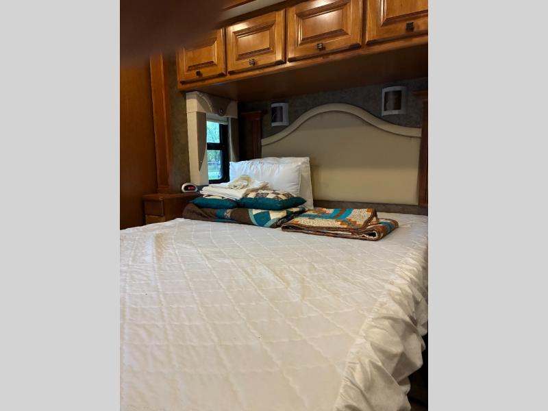 The rear bedroom includes a slide with a queen bed that has nightstands at each side and overhead cabinets above the head of the bed. The rear wall of the coach features closed storage, while the wall opposite the bed features a wardrobe with drawers below, and a vanity with a TV above it.