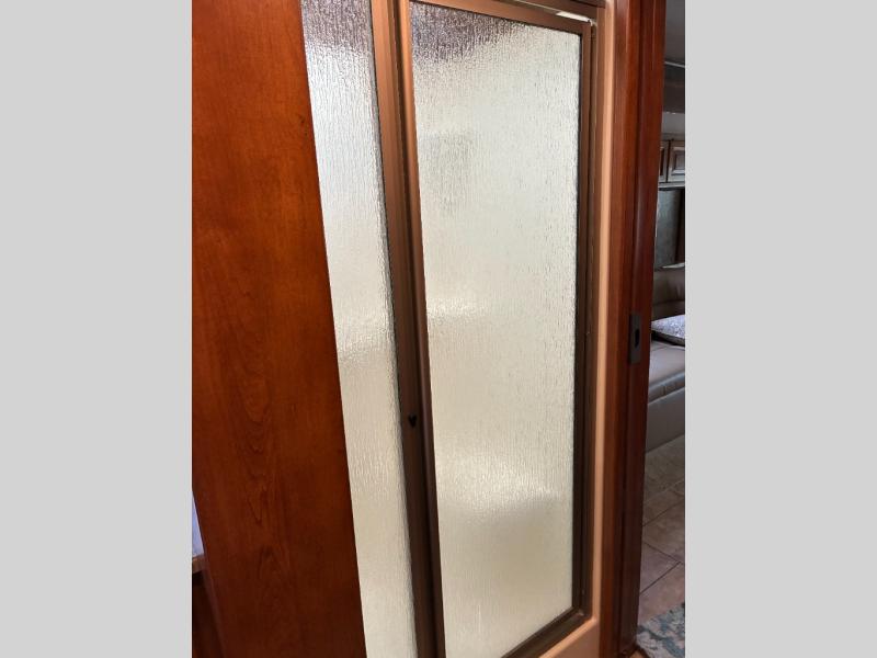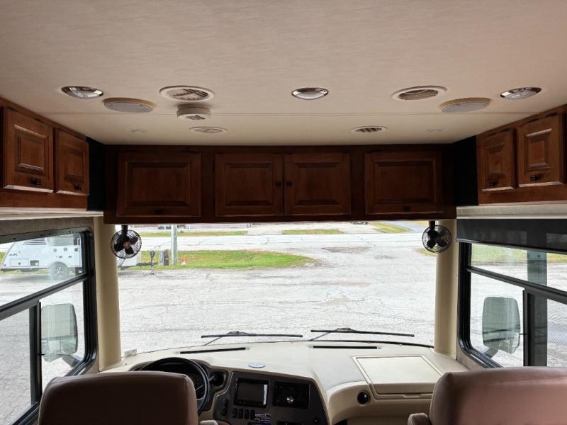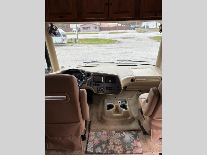 As you enter the coach, the front includes two captain's chairs, overhead cabinets at each side, an optional TV at the center front and an optional driver side door.