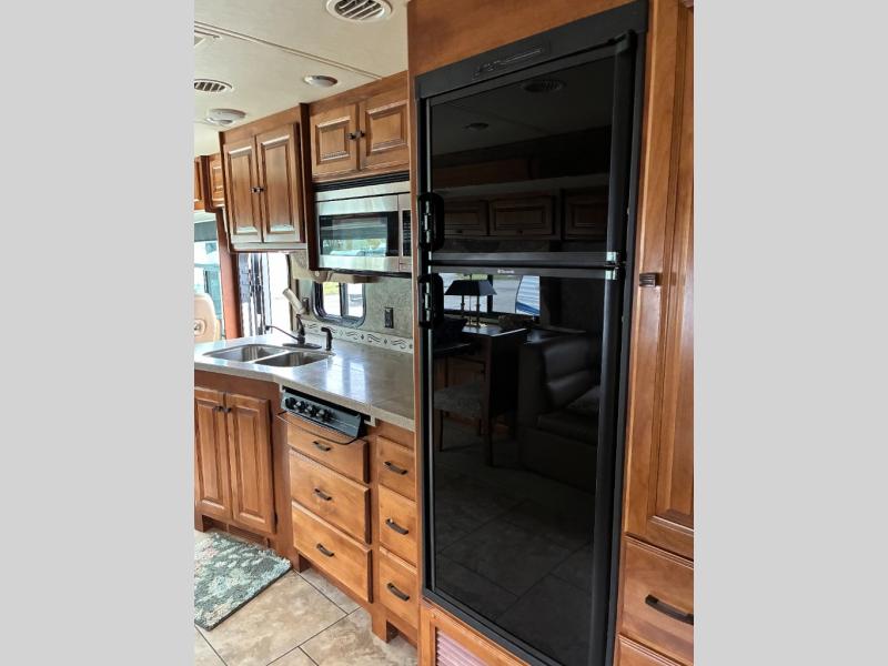 The kitchen runs along the curb side and includes overhead cabinets, an angled double sink, an overhead microwave, a three burner range, a refrigerator and a pantry.