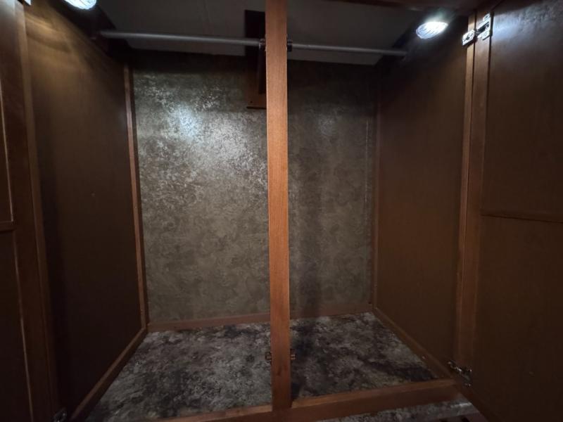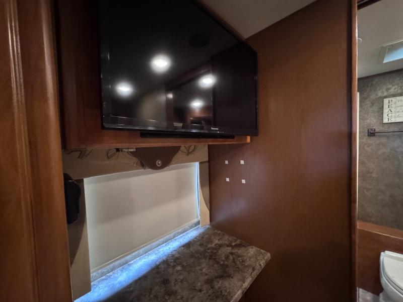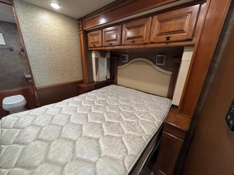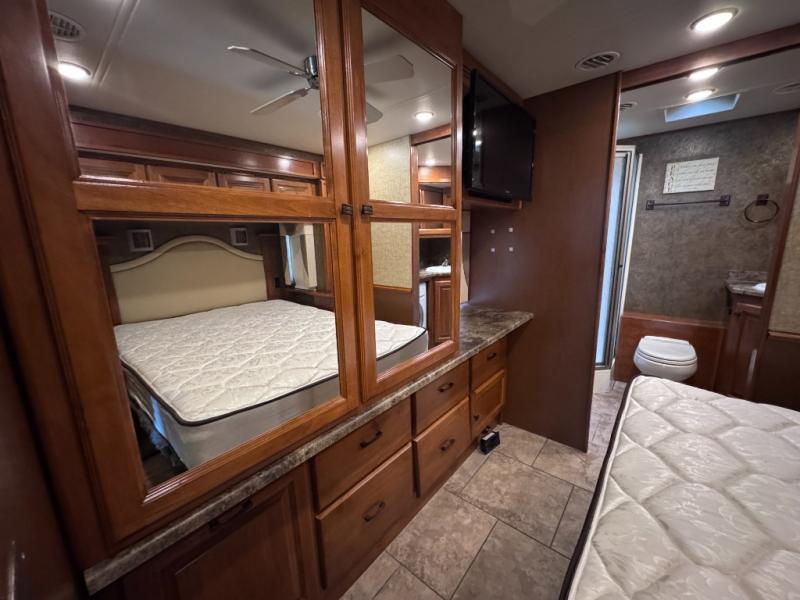 The private bedroom includes a queen bed slide with nightstands at each side and overhead cabinets. The wall opposite the bed includes a wardrobe with drawers below as well as a vanity with a TV and overhead cabinets above.