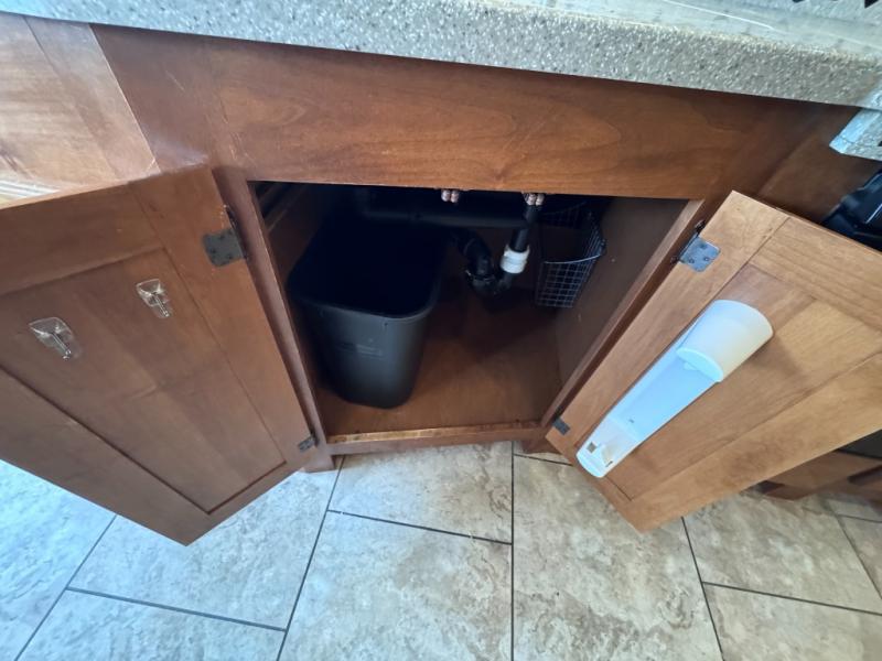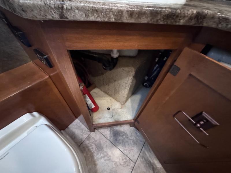 The rear bathroom provides lots of overhead cabinets, a shower, an optional tub, a toilet, a large corner vanity and sink as well as the option for under counter combo washer/dryer.