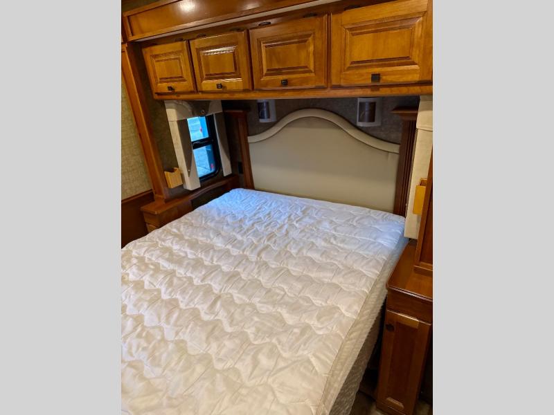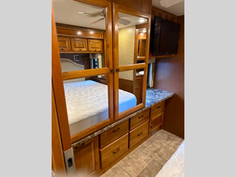 The private bedroom includes a queen bed slide with nightstands at each side and overhead cabinets. The wall opposite the bed includes a wardrobe with drawers below as well as a vanity with a TV and overhead cabinets above.
