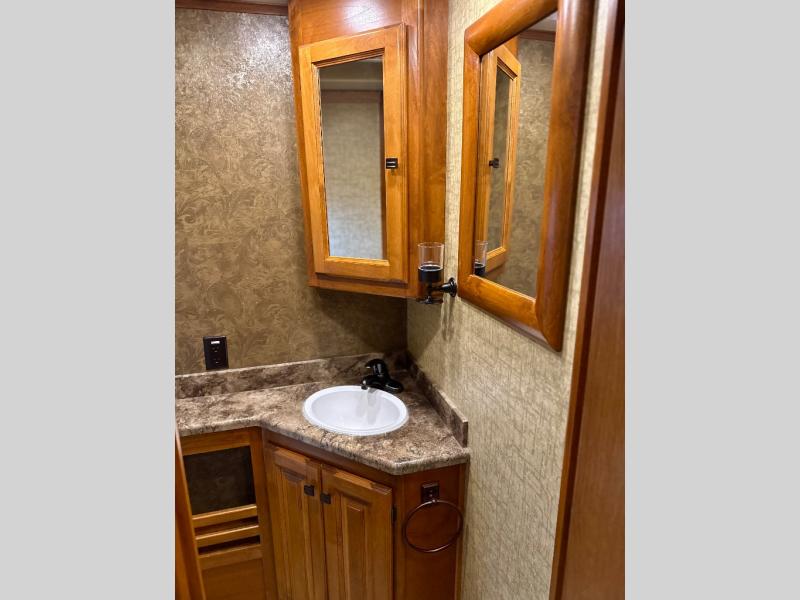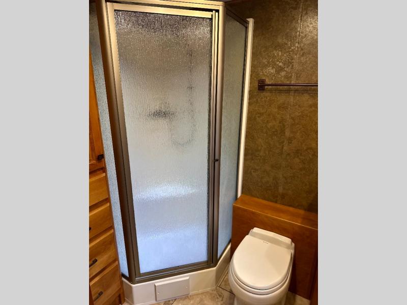 The rear bathroom provides lots of overhead cabinets, a shower, an optional tub, a toilet, a large corner vanity and sink as well as the option for under counter combo washer/dryer.