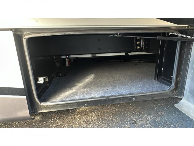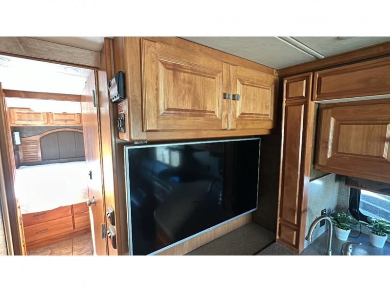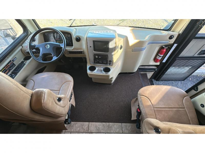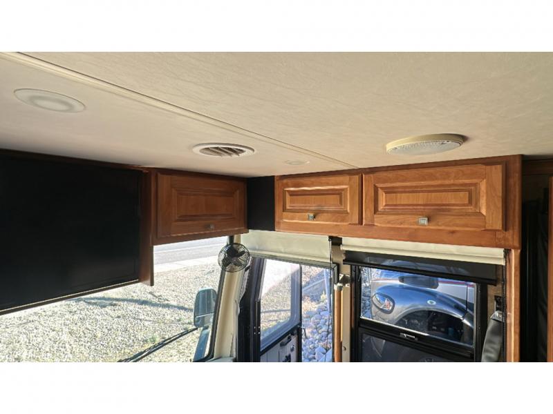 Step into the front entry to find two captains chairs, overhead cabinets, and an optional TV at the center front.