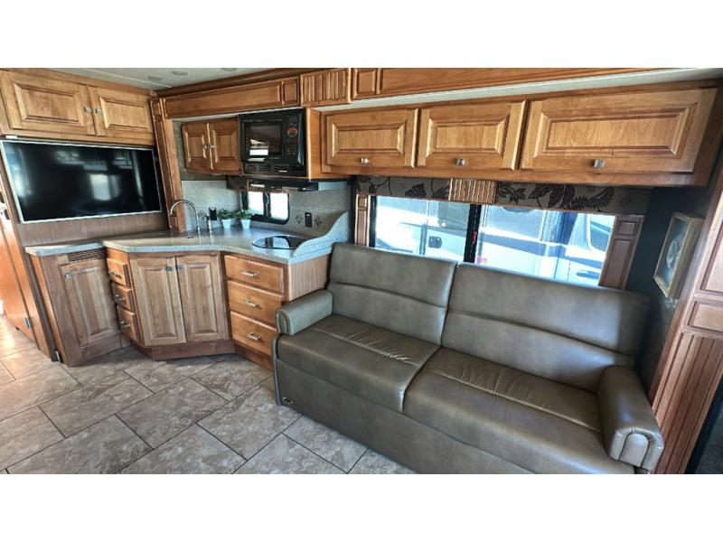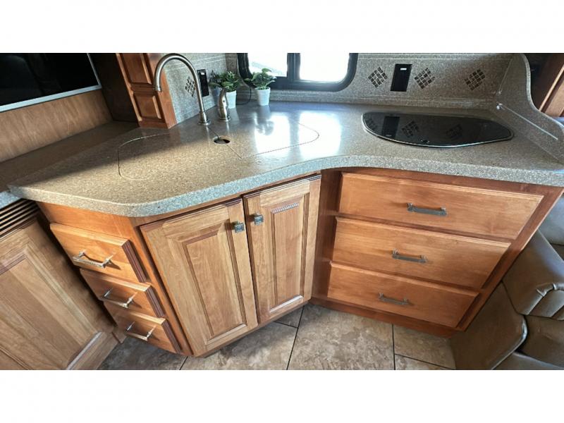 The road side features a slide housing a sofa bed, two burner range top, overhead microwave, corner angled double sink and lots of overhead cabinets. A TV is on an inside wall near the sink, and it faces the front of the coach.