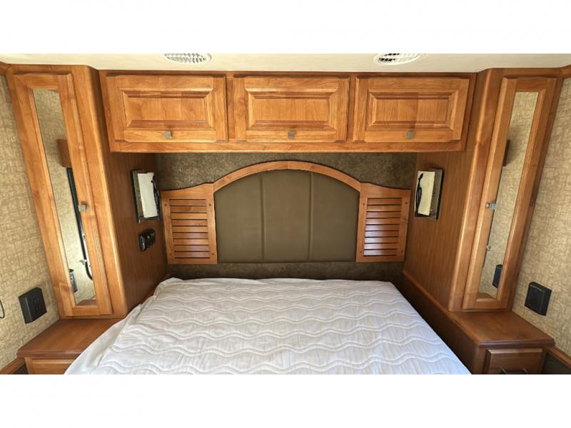 The rear bedroom holds a queen size bed with closets above nightstands at each side of the bed. There is a closet opposite the bed, as well as space for an optional TV.