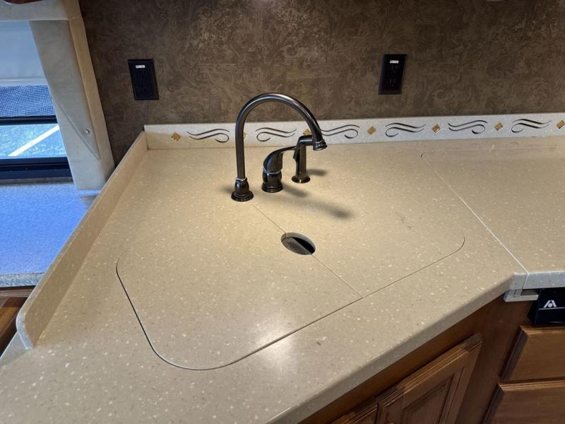 The kitchen is along the curb side within a generous slide out. It includes a pantry, 2-door refrigerator, three burner range, overhead microwave, angled double sink, overhead cabinets and a booth dinette. You may choose an optional residential refrigerator with 4 batteries and/or a dinette with computer workstation.