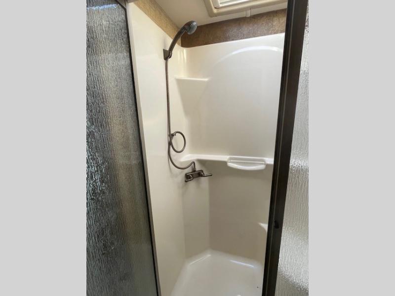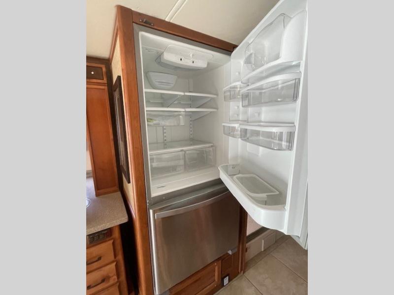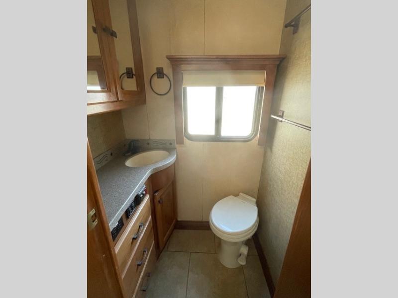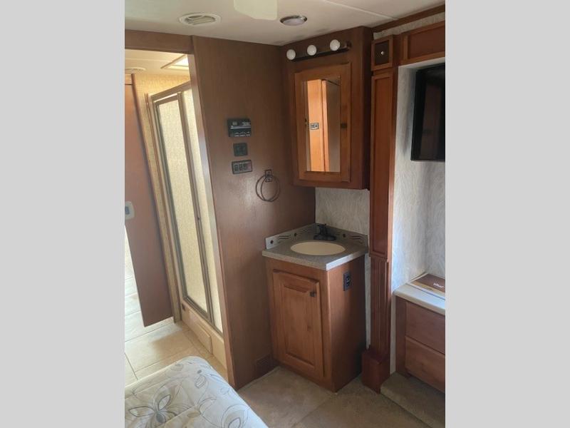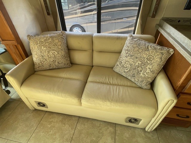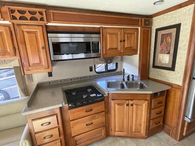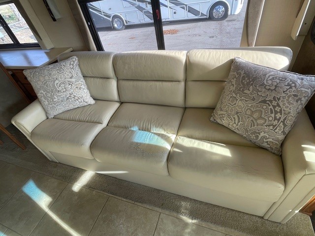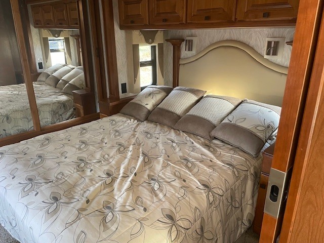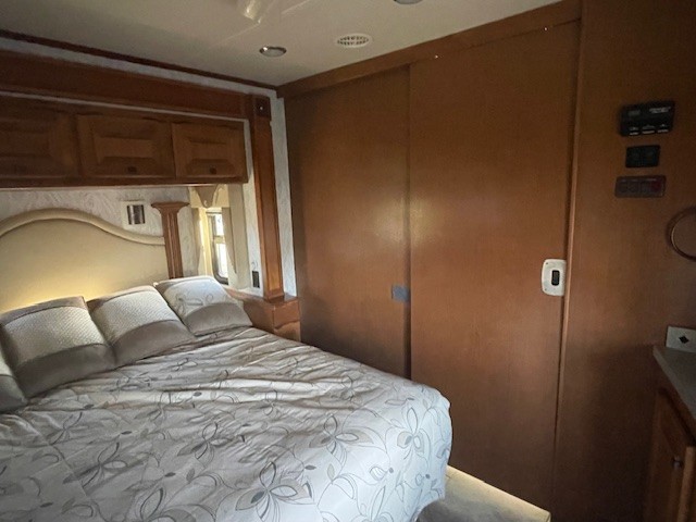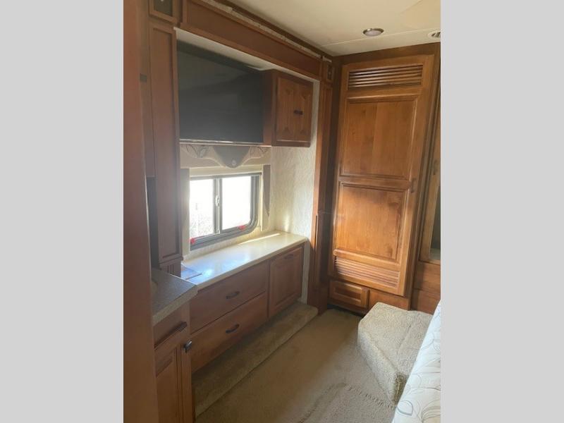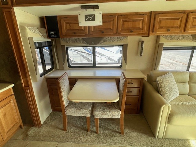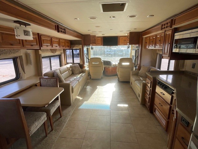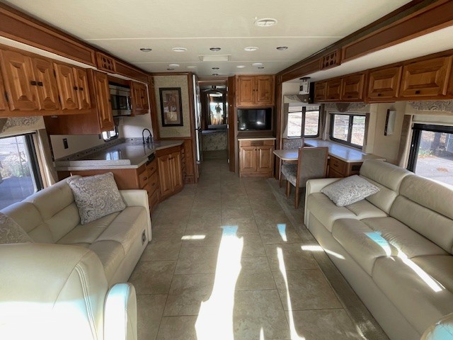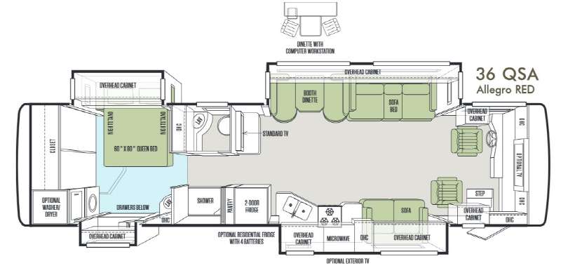 The road side also includes a slide and it provides a sofa bed, booth dinette and overhead cabinets. In place of the dinette, you may choose a dinette with computer workstation. A standard TV facing the front of the coach is on an inside wall.