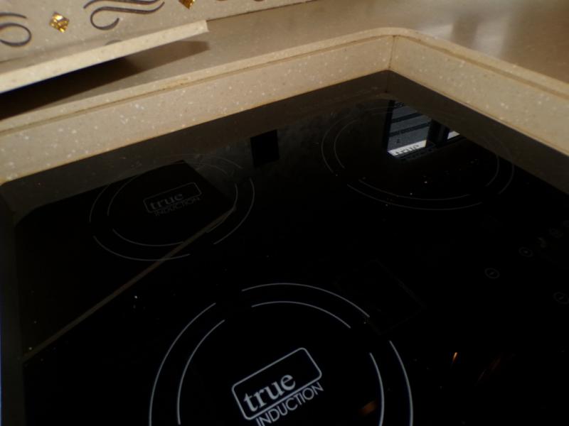 The curb side also provides a slide out housing a sofa, lots of overhead cabinets, a three burner range, overhead microwave, and angled kitchen sink. A closet for an optional washer/dryer is on the interior wall just beyond this slide.