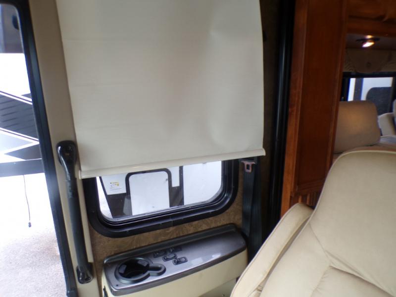 The front cab area holds two rotatable captain's chairs, overhead cabinets all around and an optional center TV.