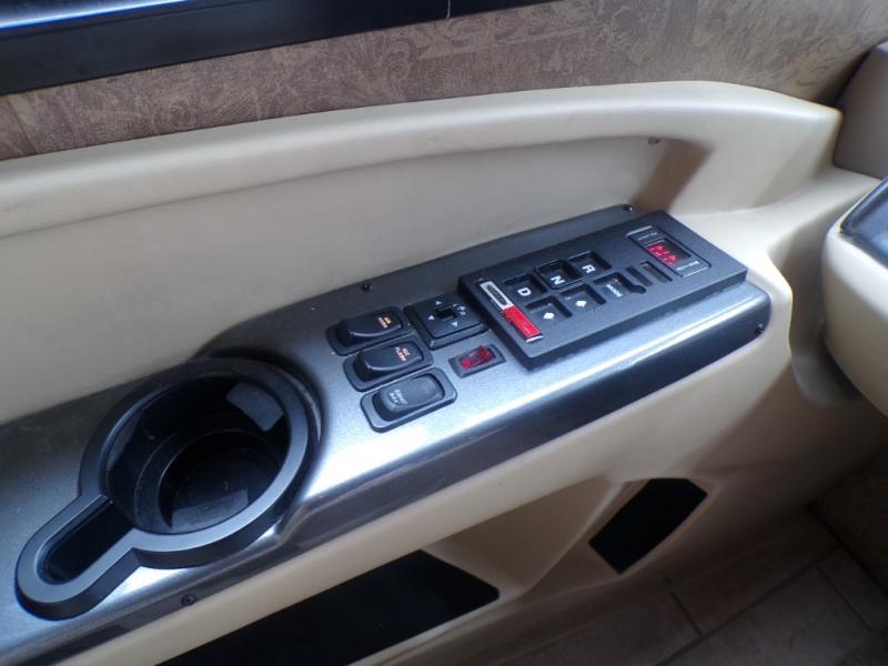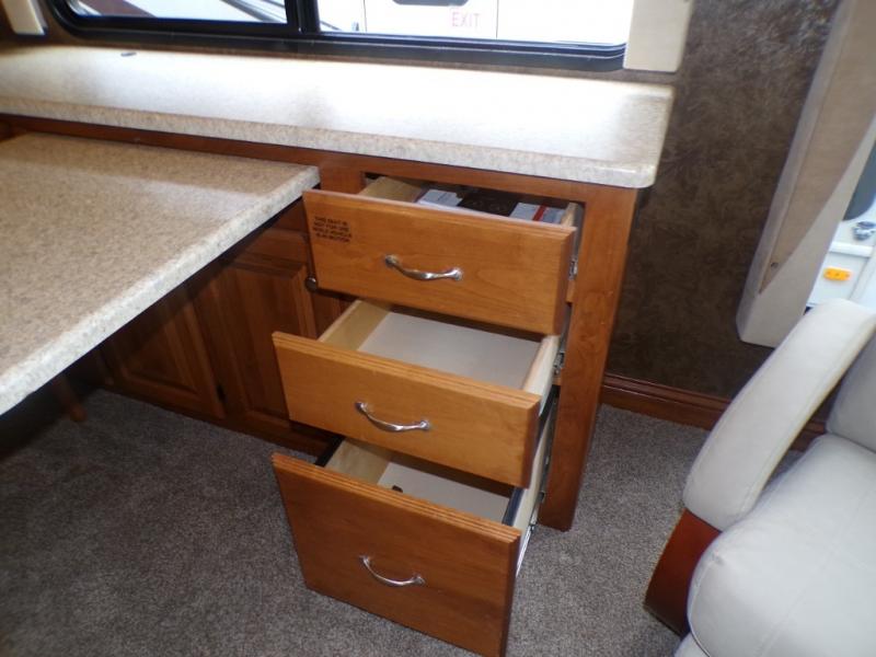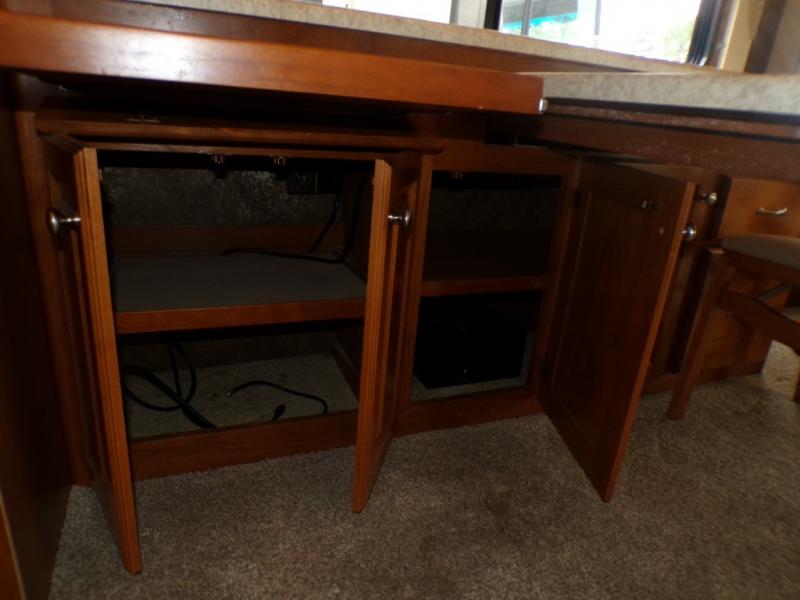 The road side provides a slide out with a generous u-shaped dinette, overhead cabinets, a partial pantry, a 2-door refrigerator and another full pantry. You may choose to have the slide include a lounge chair, dinette with computer workstation, overhead cabinets, refrigerator and pantry. You may also choose an optional 4-door residential refrigerator with 4 batteries. A standard TV faces the front of the coach and is on an interior wall.