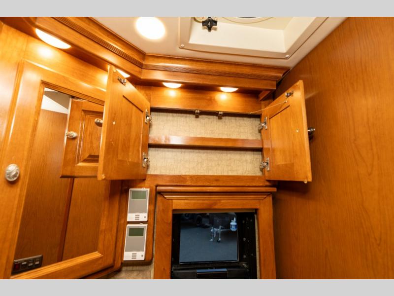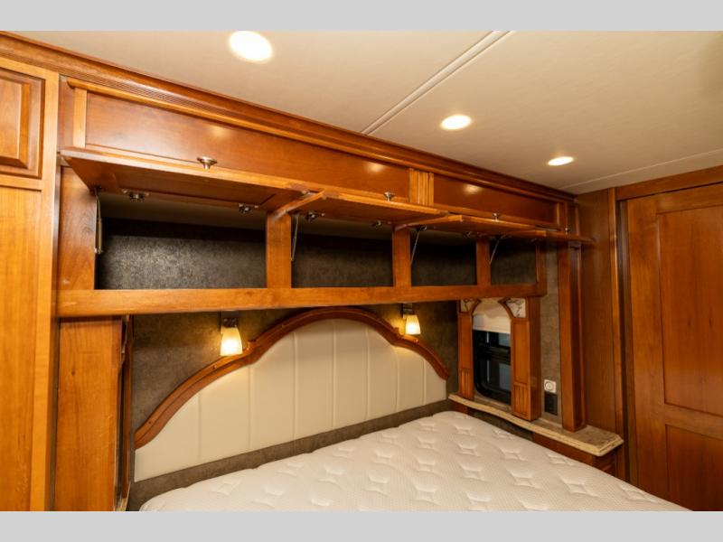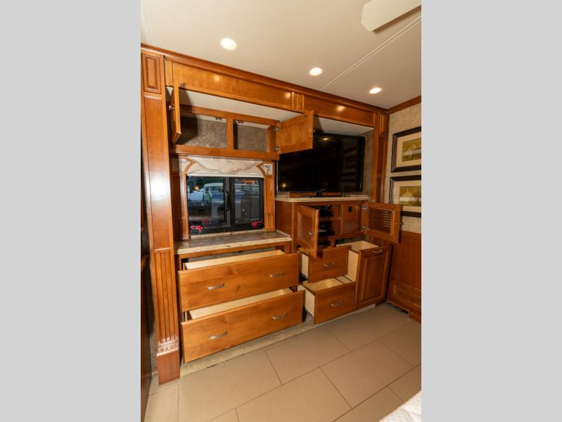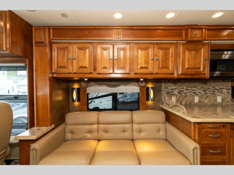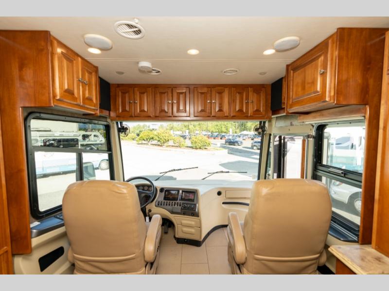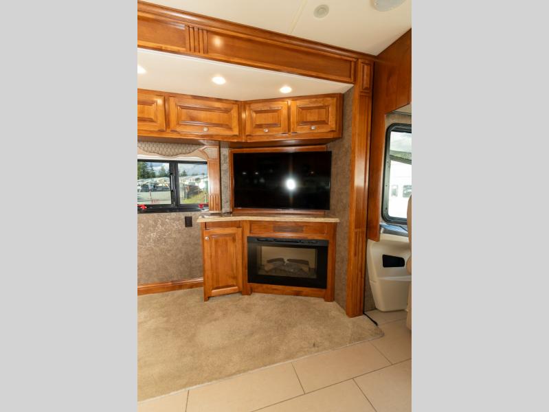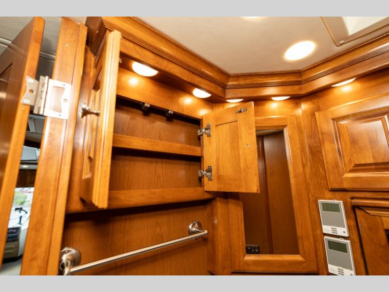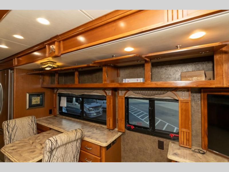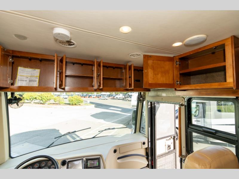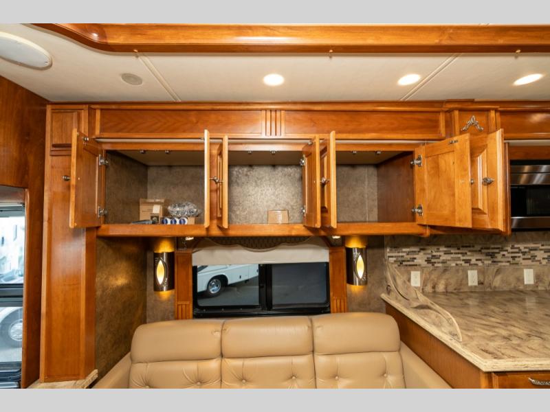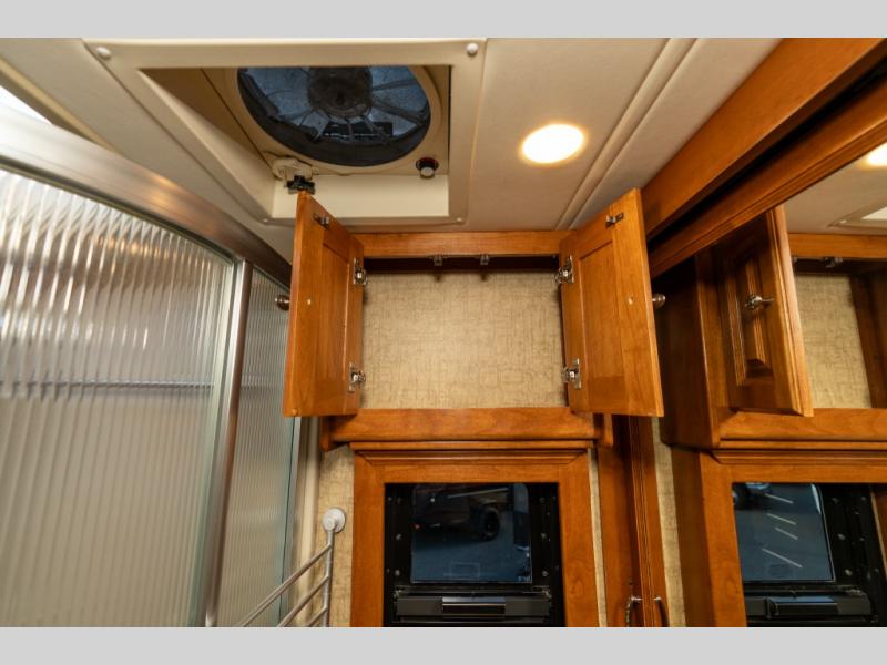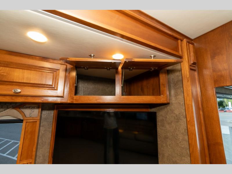As you enter this class A diesel motorhome at the front curb side, the front of the coach includes lots of overhead cabinets as well as the option for a center mounted TV.