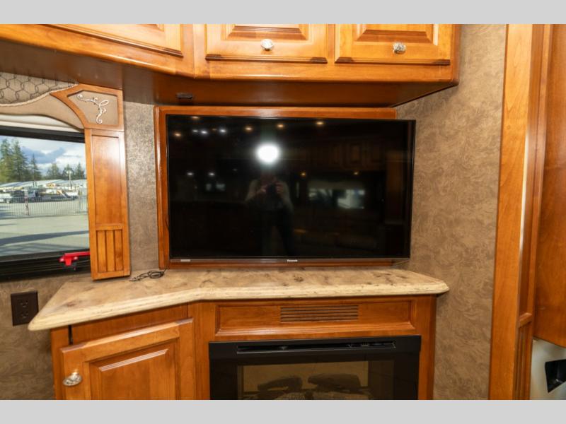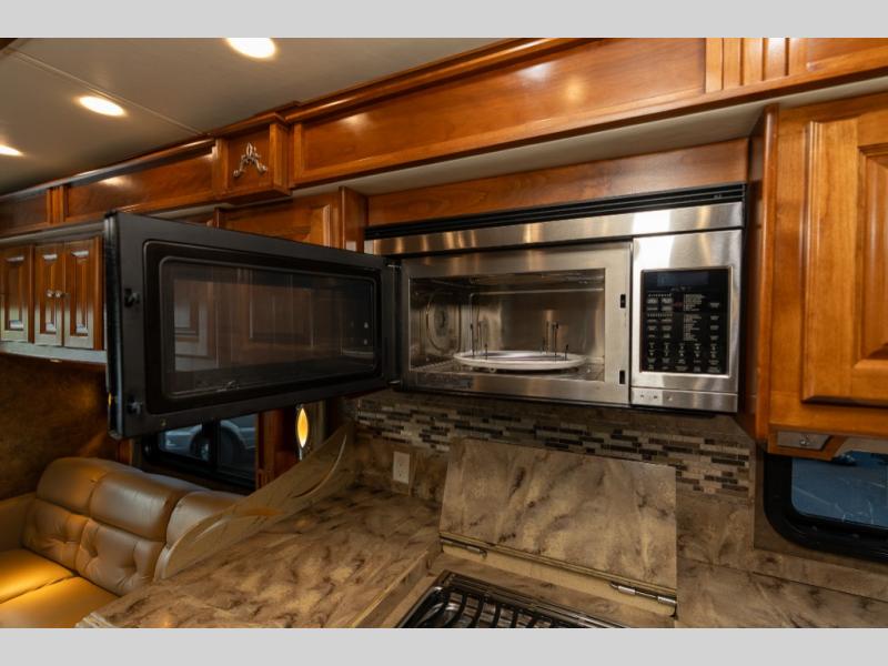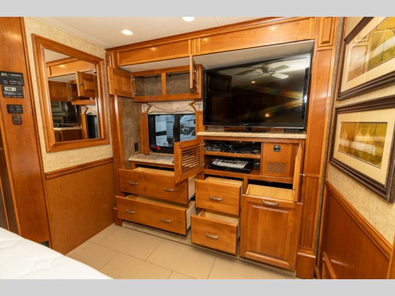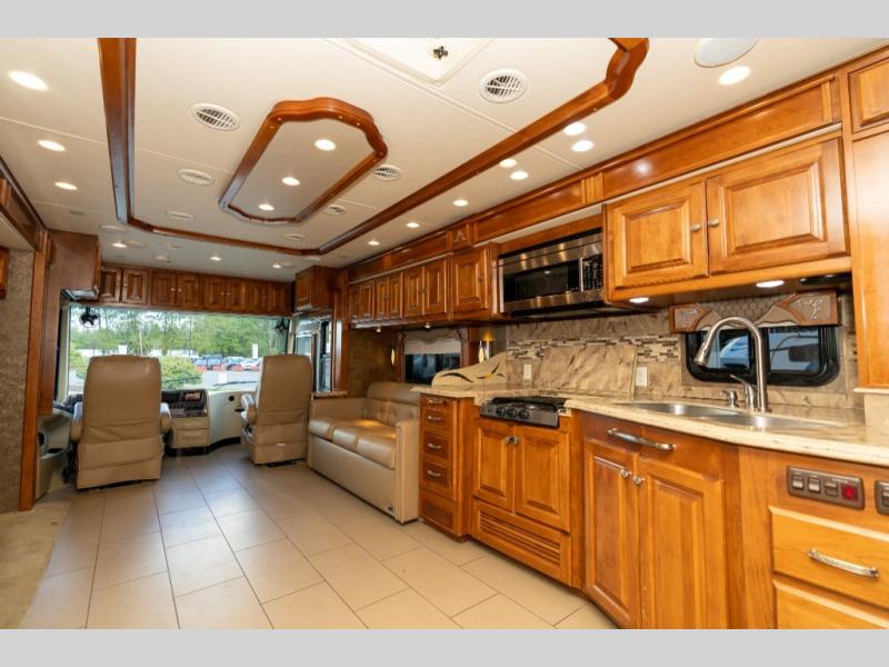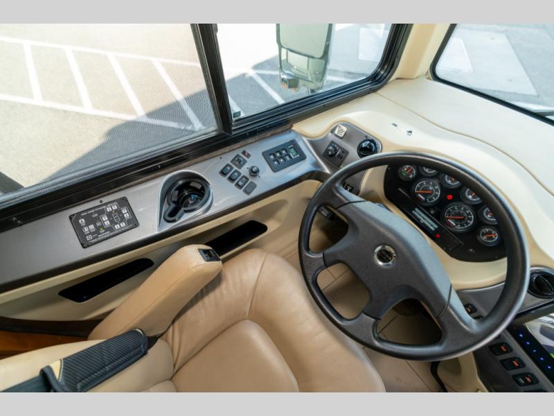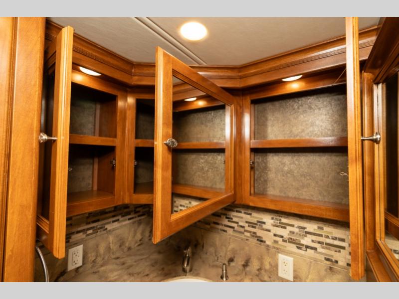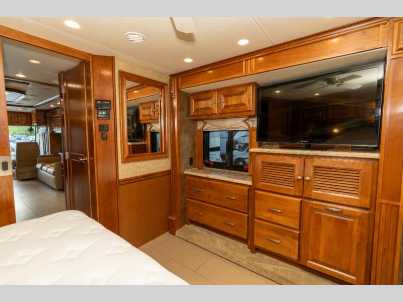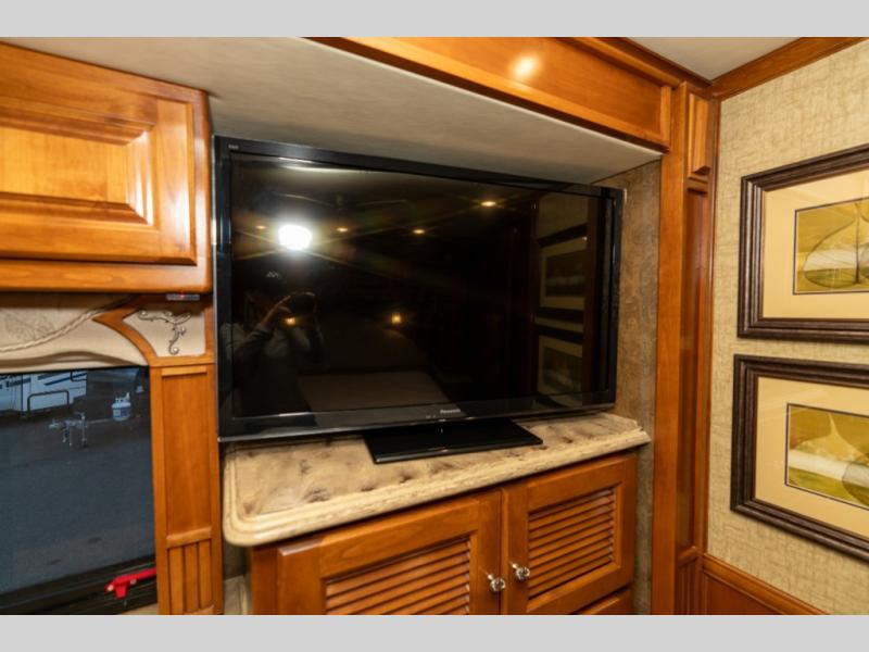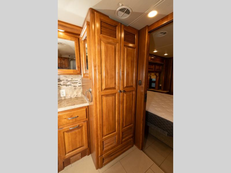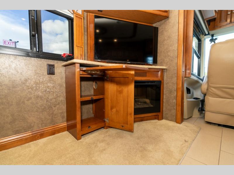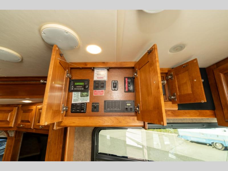 As you enter this class A diesel motorhome at the front curb side, the front of the coach includes lots of overhead cabinets as well as the option for a center mounted TV.