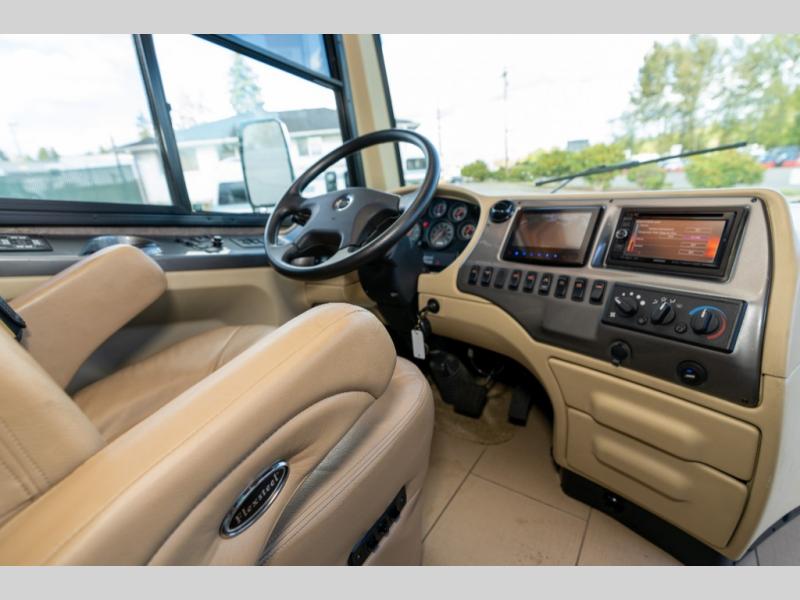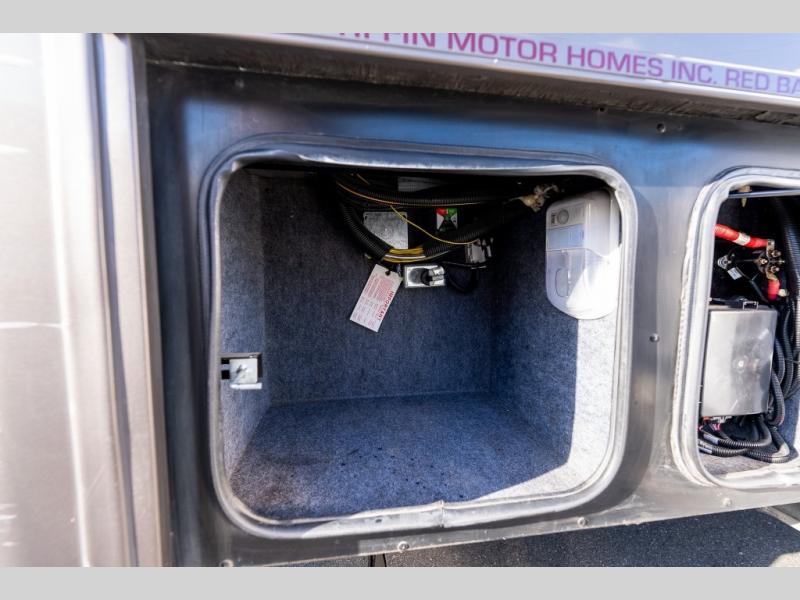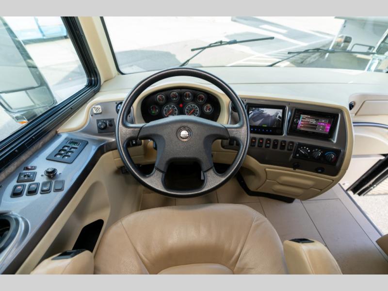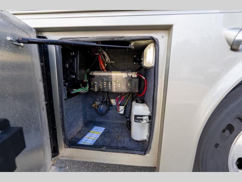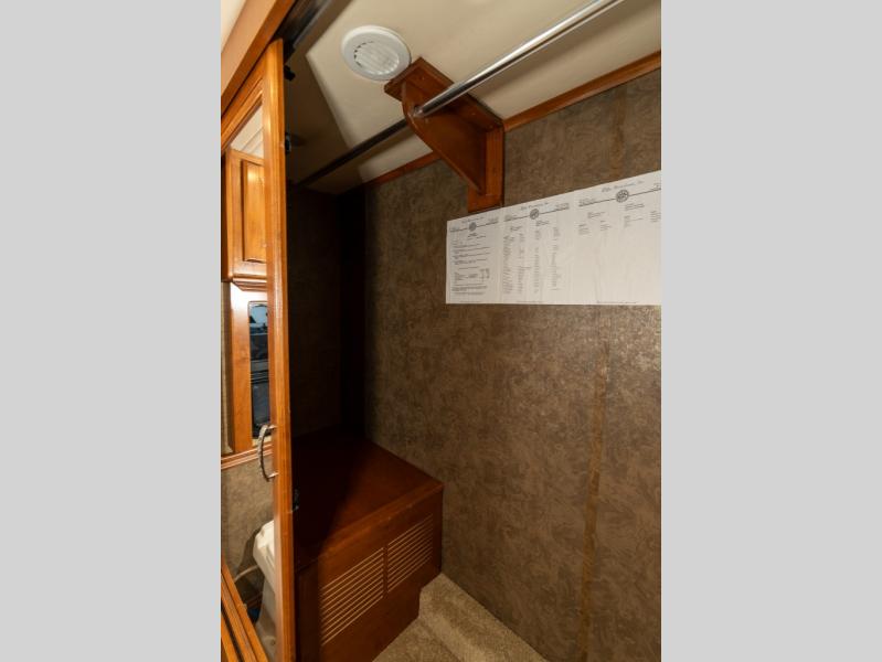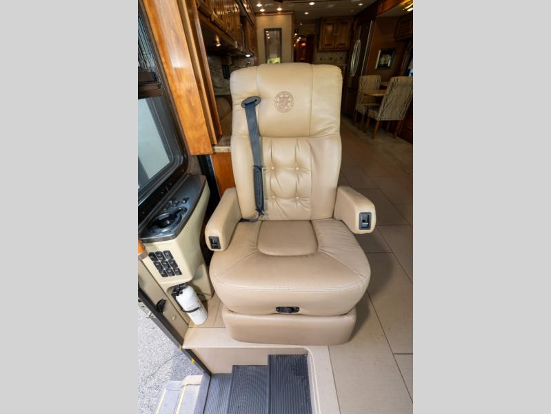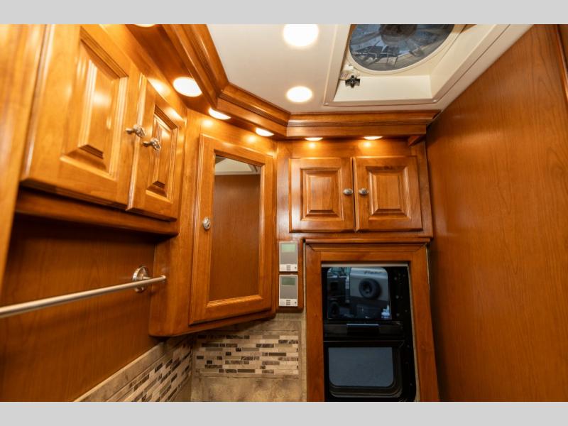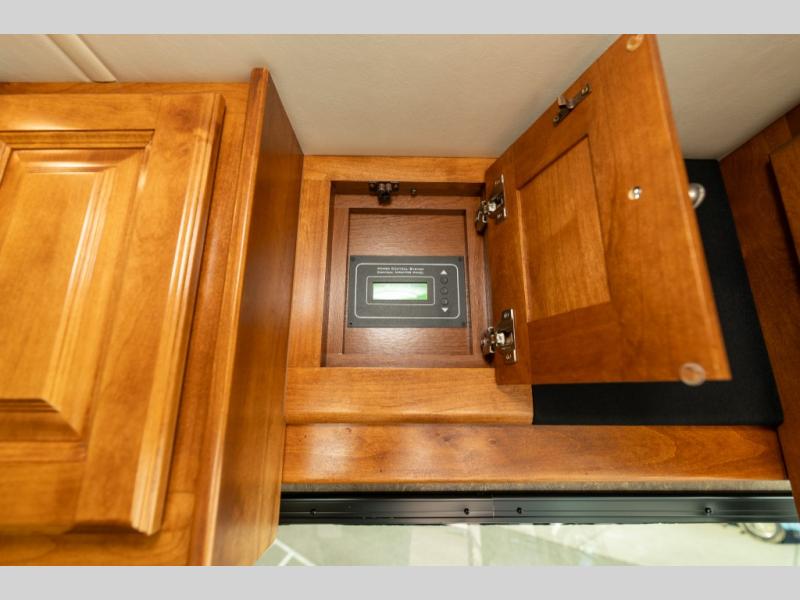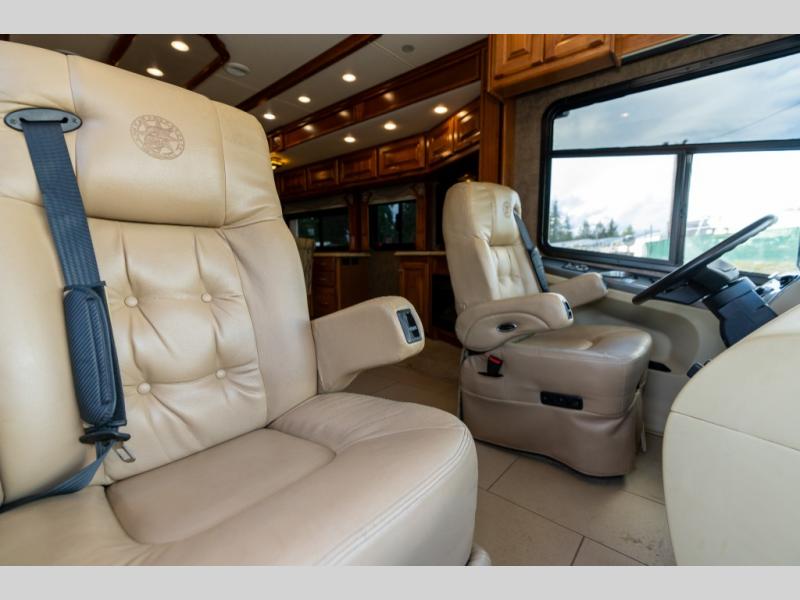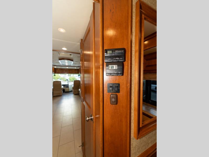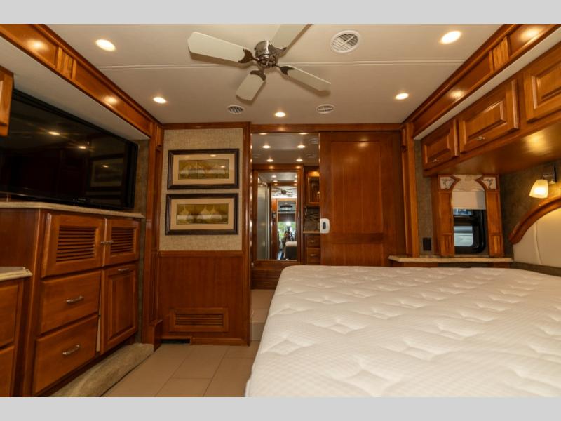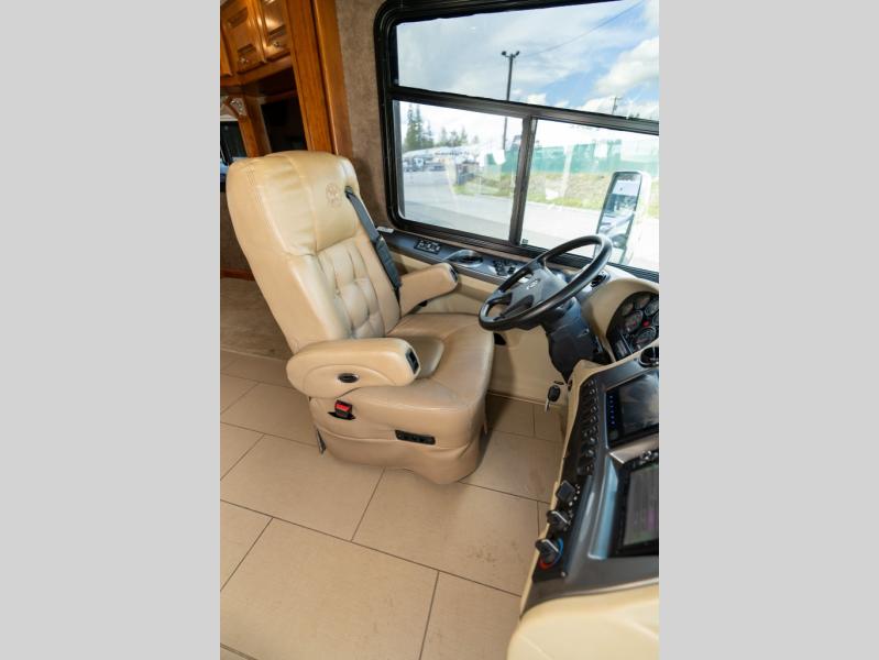 As you enter this class A diesel motorhome at the front curb side, the front of the coach includes lots of overhead cabinets as well as the option for a center mounted TV.