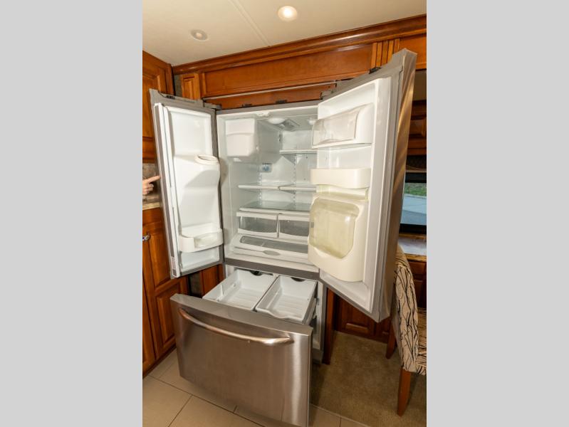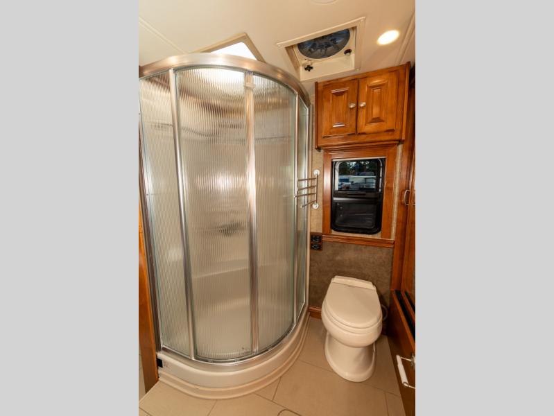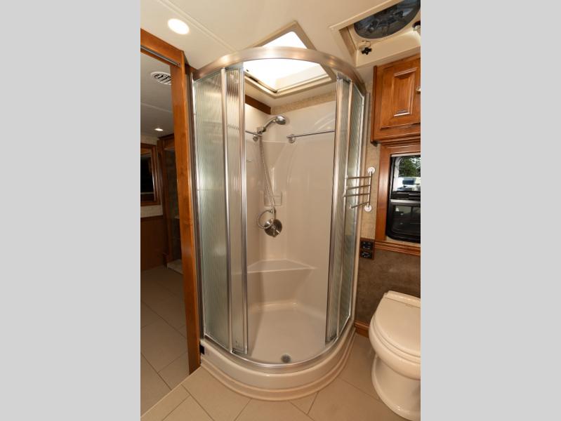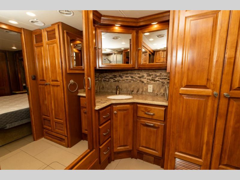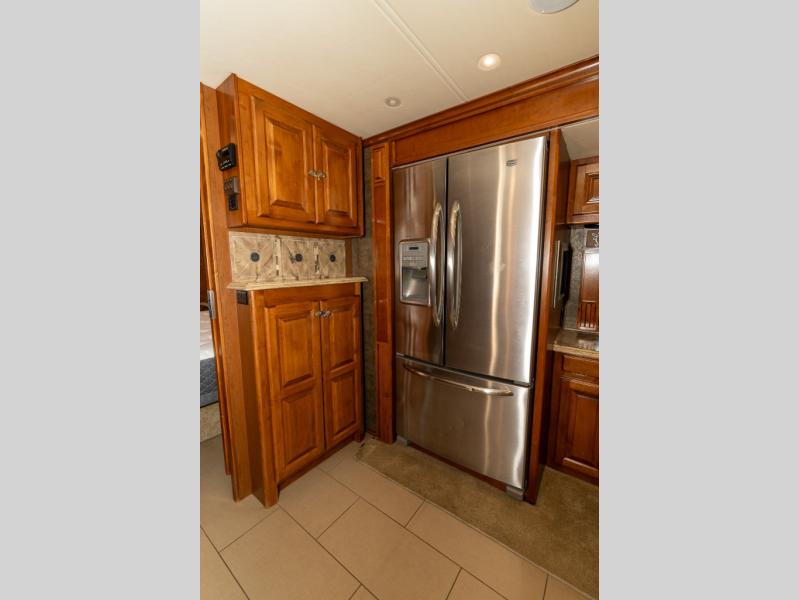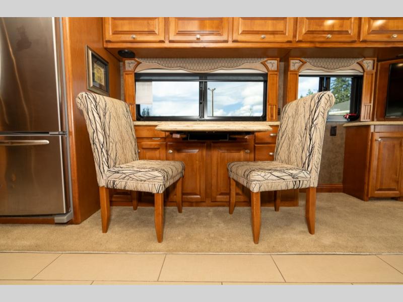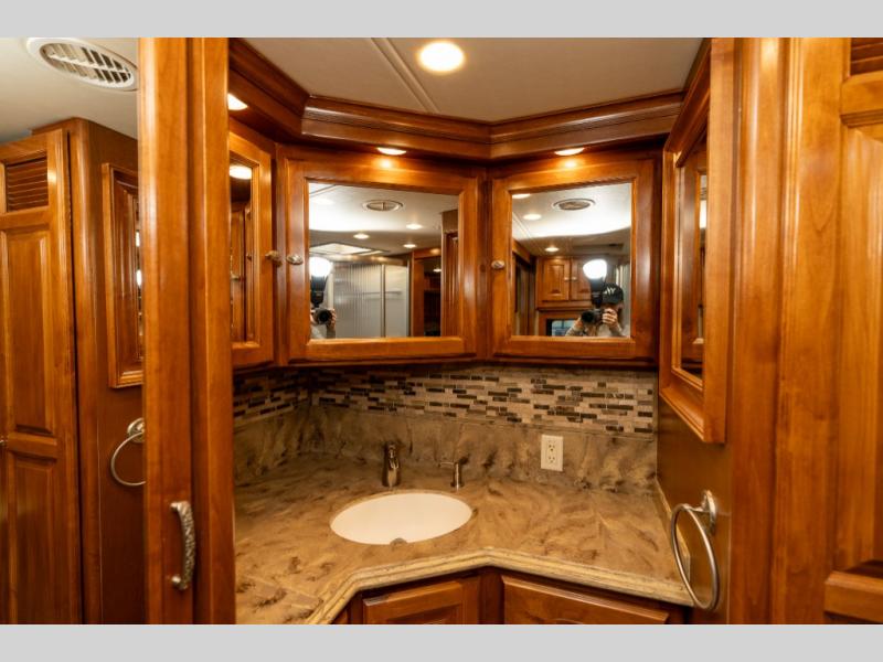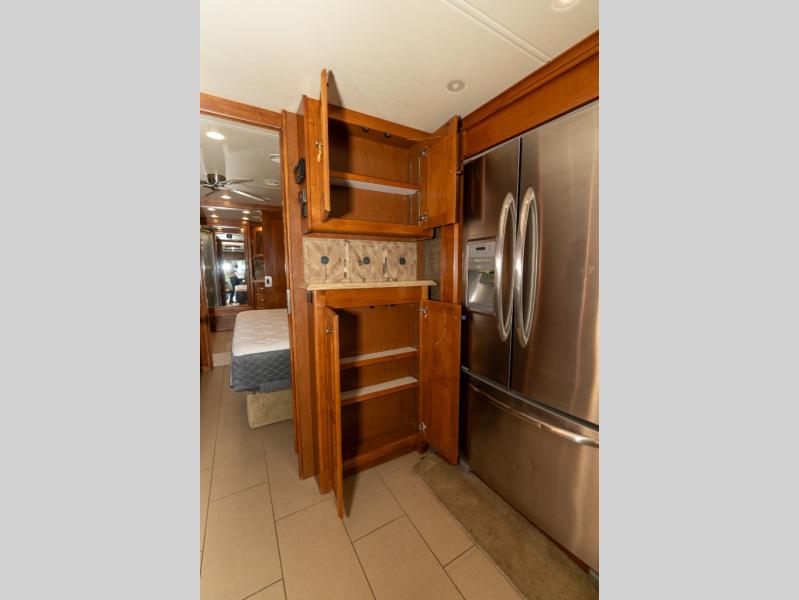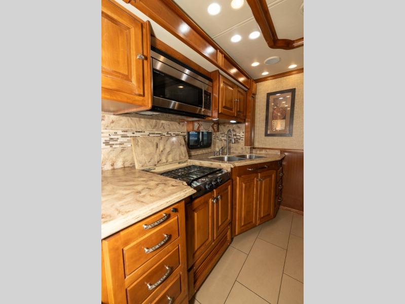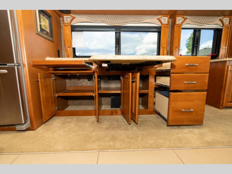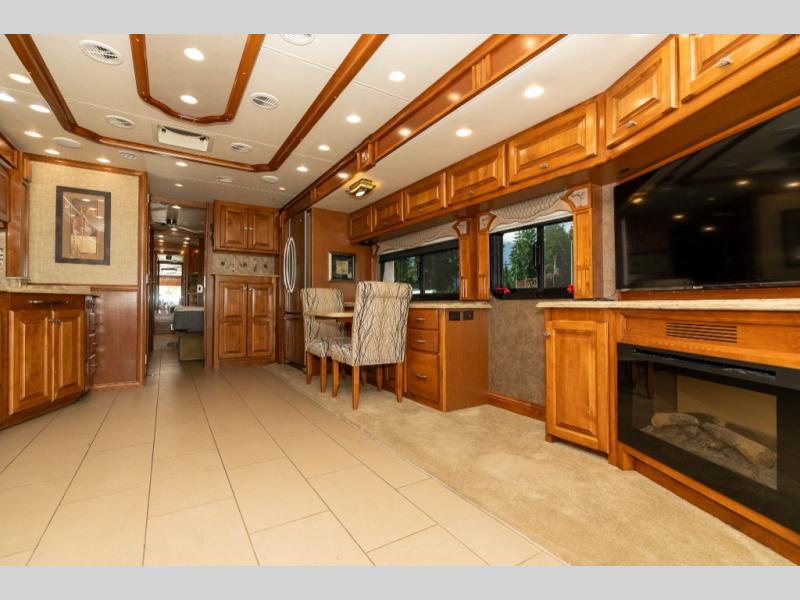 Moving down the road side, a slide out houses a sofa bed, booth dinette, overhead cabinets and residential refrigerator. You may choose an optional gas/electric refrigerator. You may also make choices for the other contents of the slide includes a u-shaped booth dinette, a dinette with computer workstation, or an entertainment center with one leather lift recliner and flip table. Just back inside the coach, there is a TV facing the front with the option for a fireplace below.