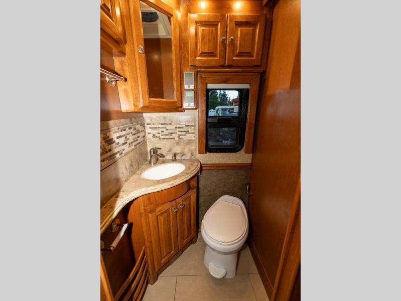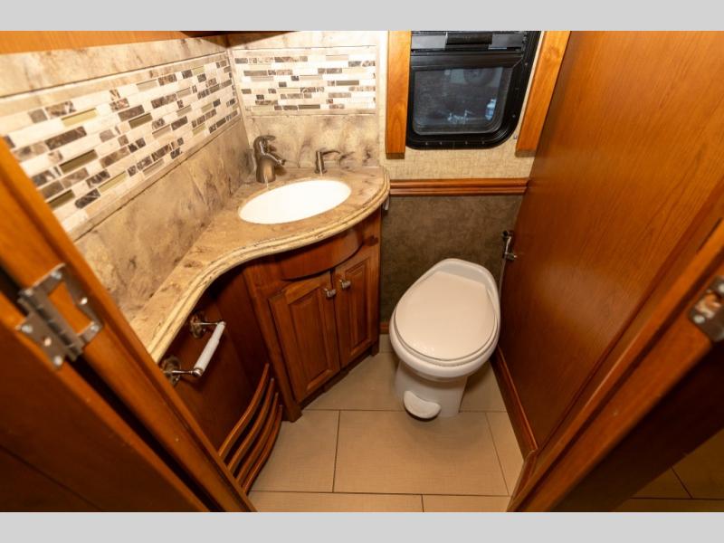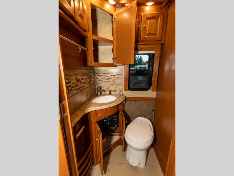 Across the motorhome, a half bath includes a toilet, vanity sink and overhead cabinets.