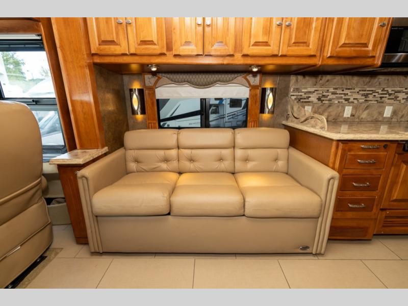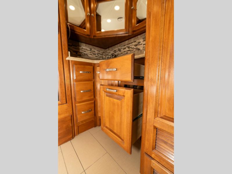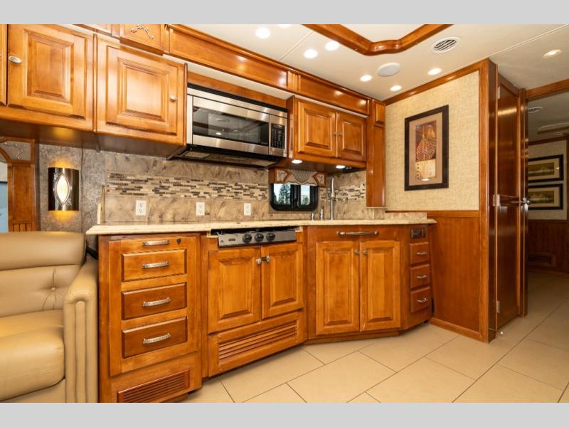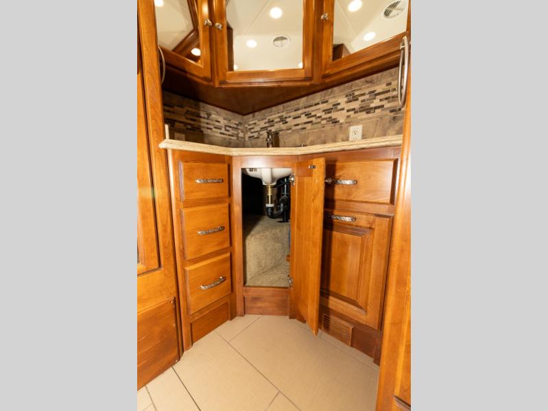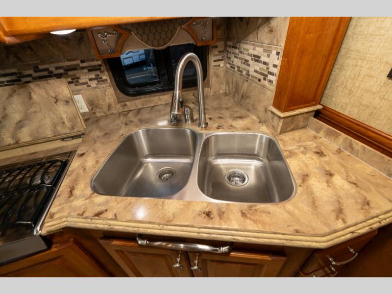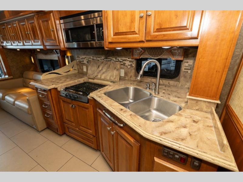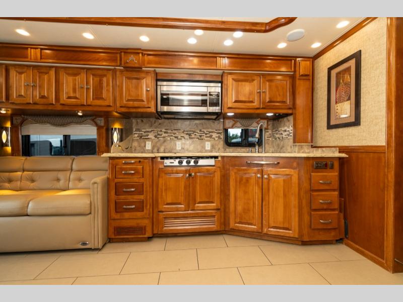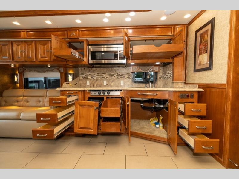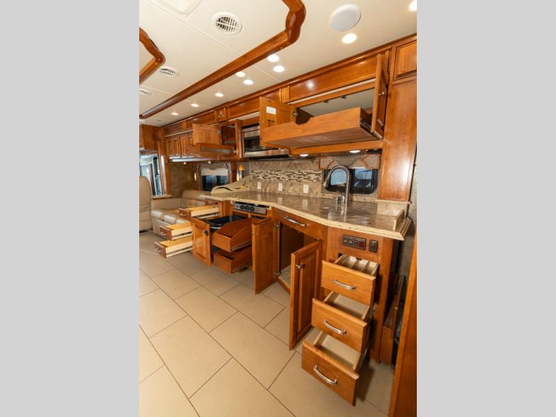 Continuing toward the front, a slide holds the main components of the kitchen including an angled double kitchen sink, range, overhead convection microwave, overhead cabinets and a sofa bed. You may choose two leather lift recliners in place of the sofa bed as well as an optional exterior TV.