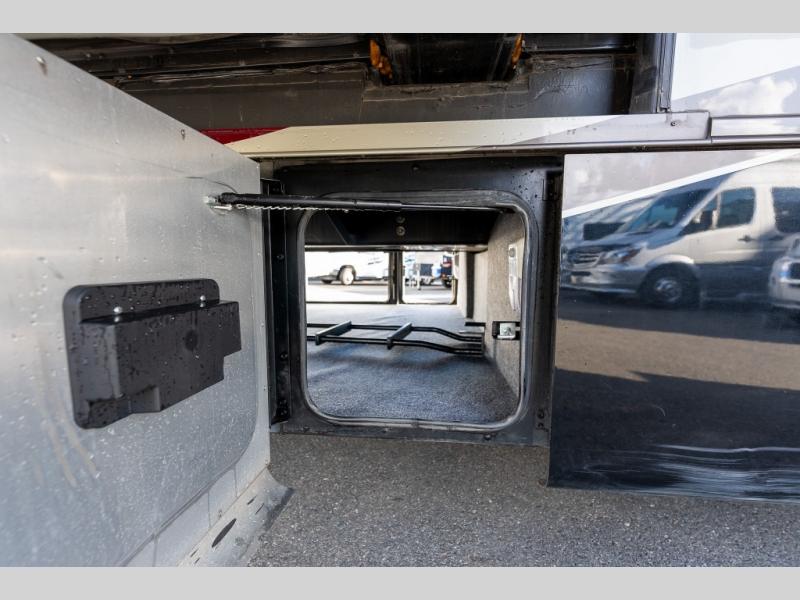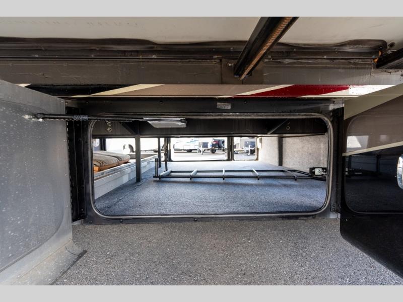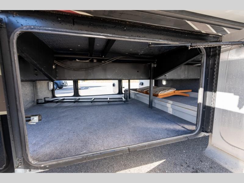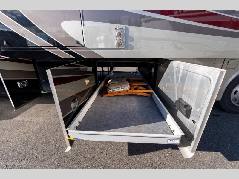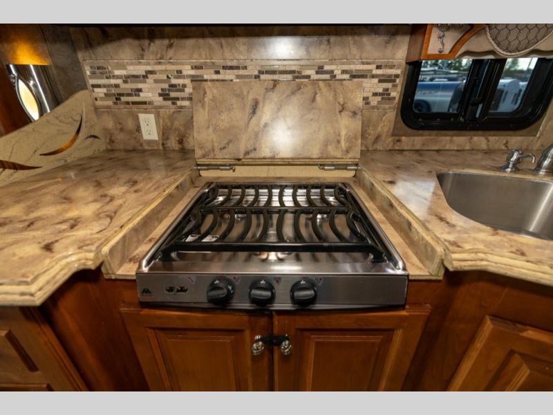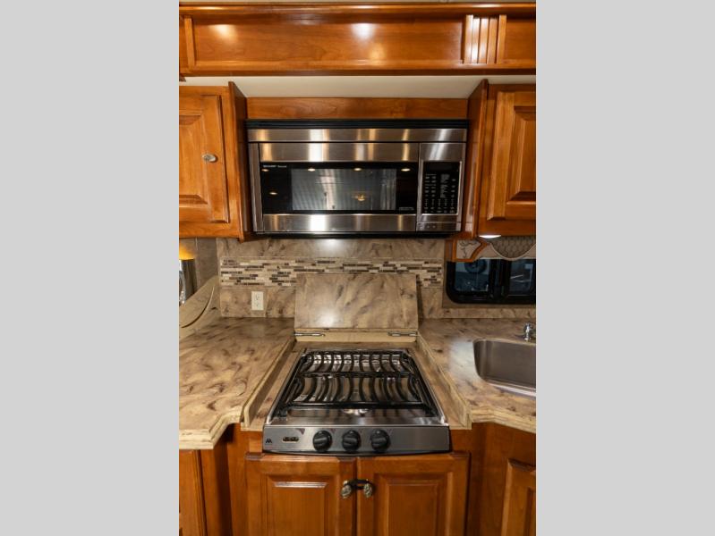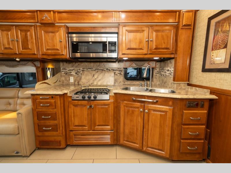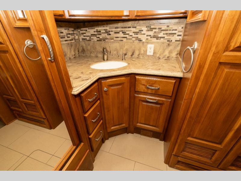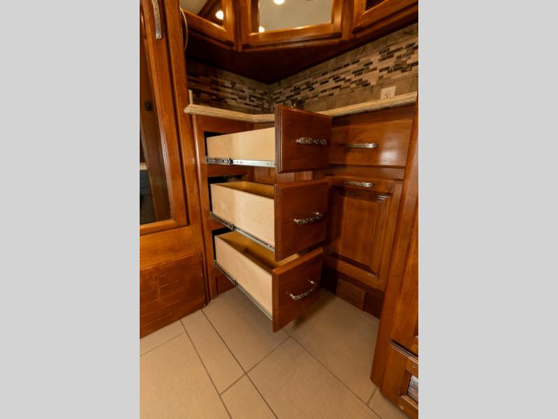 Continuing toward the front, a slide holds the main components of the kitchen including an angled double kitchen sink, range, overhead convection microwave, overhead cabinets and a sofa bed. You may choose two leather lift recliners in place of the sofa bed as well as an optional exterior TV.