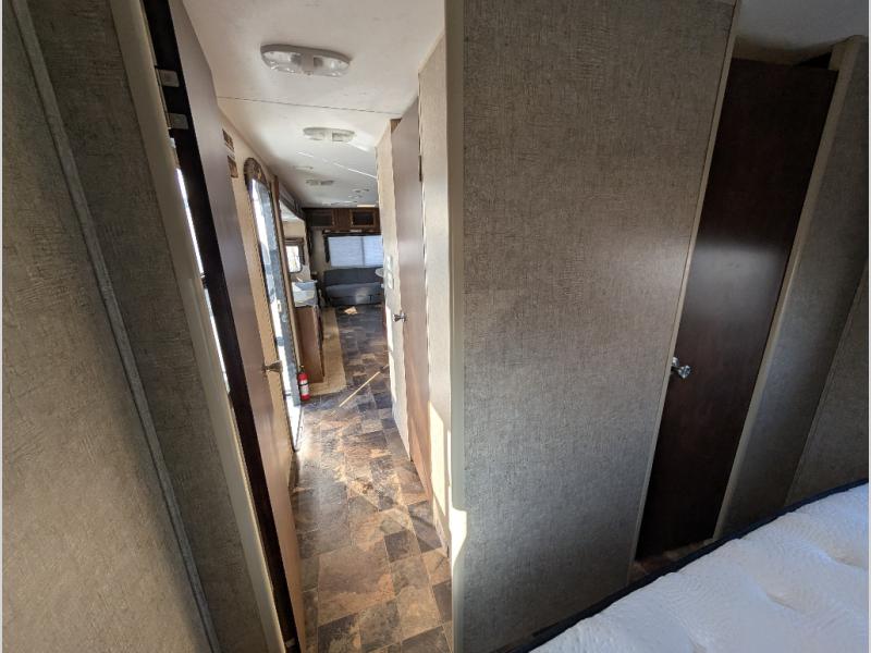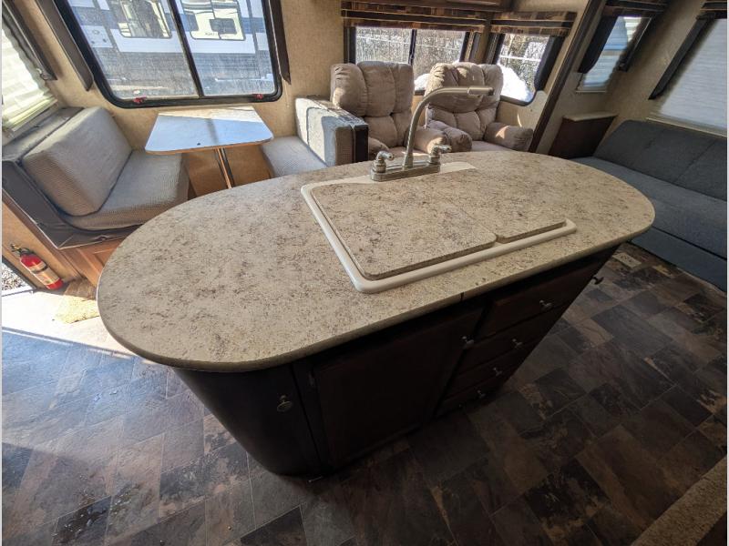 To the left of the entrance there is a slide with a dinette and two theater seats. Along the rear wall you will find a sofa. The other slide in the main living area has an entertainment center, pantry, three burner range, and refrigerator. Next to the slide is a nice size hutch. The kitchen island has a double kitchen sink, and extra counter space.