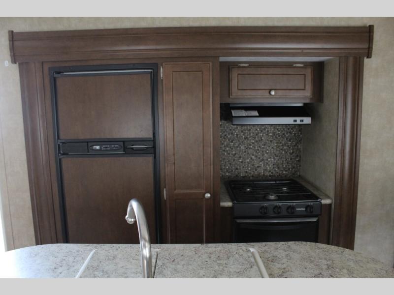 As you enter the travel trailer, to the left there is a slide with a refrigerator and three burner range. Next to the slide you will find a large pantry. The opposite side of the travel trailer has a slide with a grand dinette and a jiffy sofa. In the middle of the kitchen you will find a kitchen island with a double kitchen sink and extra counter space. Along the front of the living and kitchen areas there is a nice size entertainment center.