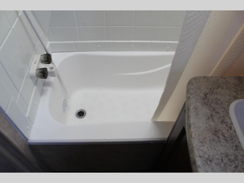 As you proceed toward the rear of the travel trailer the bathroom is on the left. Inside the bath you will find a toilet, sink, and tub/shower. There is also a private entrance outside from the bathroom.