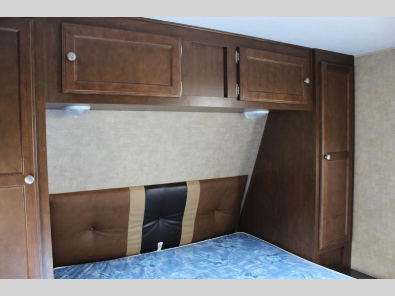 There are plenty of overhead cabinets throughout the inside of the travel trailer as well as a large exterior pass thru storage area.