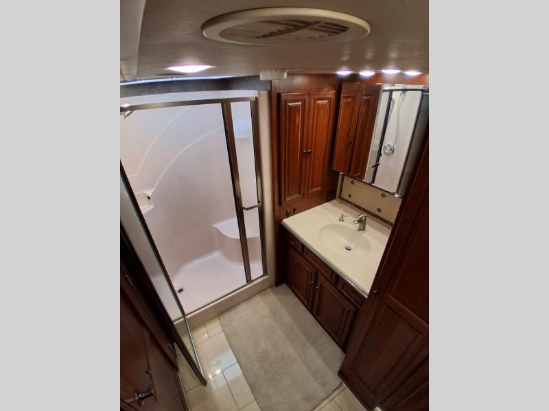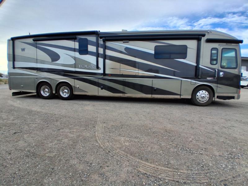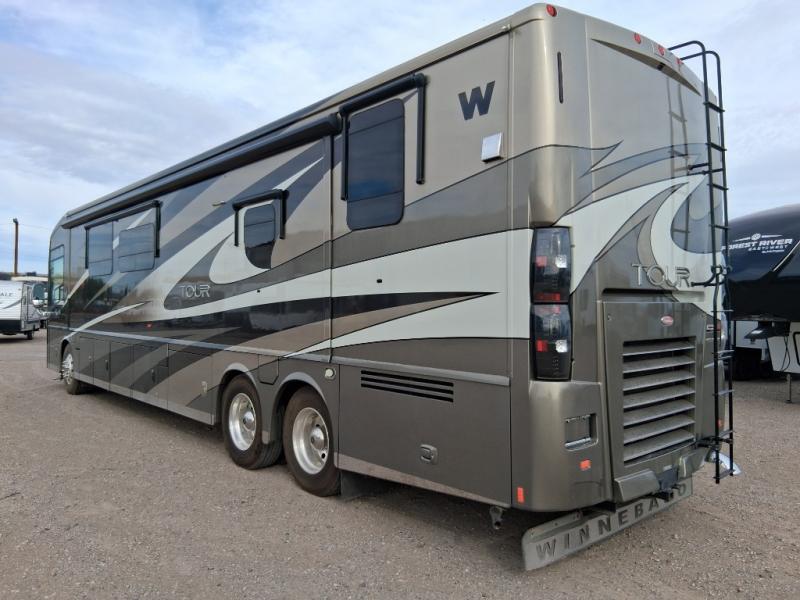 Tour Class A Diesel by Winnebago w/1-1/2 Bath Including Rear Full Bath w/Shower, Storage Cabinet, Sink, Toilet, King Bed Slide w/Nightstands, Ward./26" LCD TV/Ward./Pantry/Residential Refrig./Extendable Dining Table & Chairs/Recliner/Pull-Out Table & 40" LCD TV Slideout, Rest Easy Extendable Sectional Sofa/Pull Out Island/3 Burner Range & Dbl. Kitchen Sink Slide, 1/2 Bath w/Vanity & Sink and More! Available Options May Include: Euro Recliner, Washer/Dryer, Fireplace, 2 Ottomans.