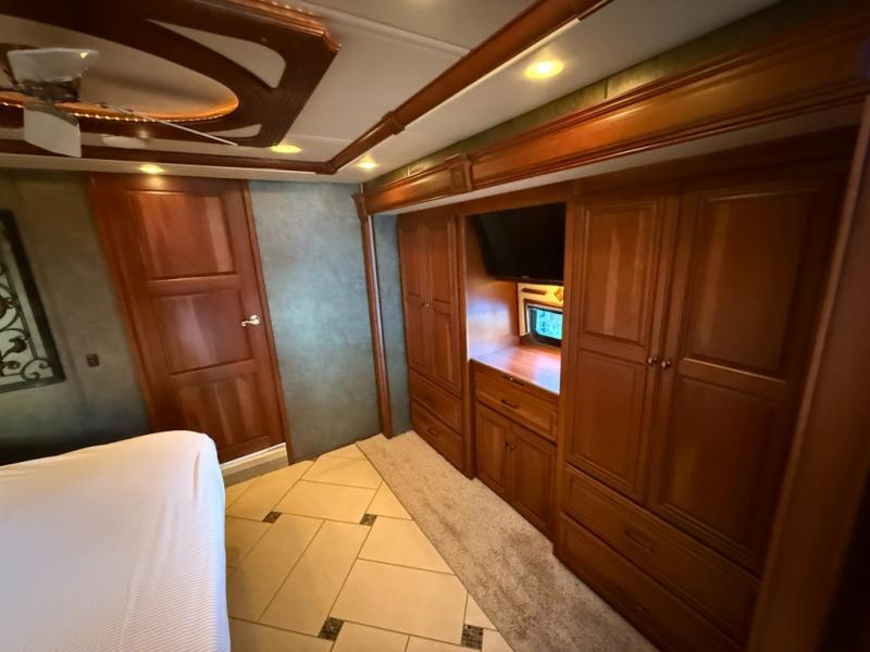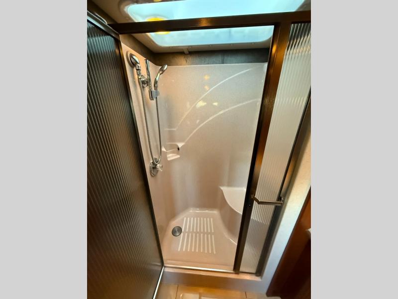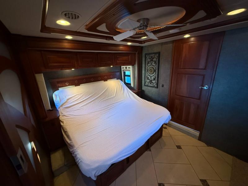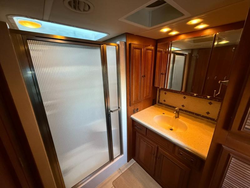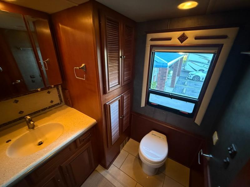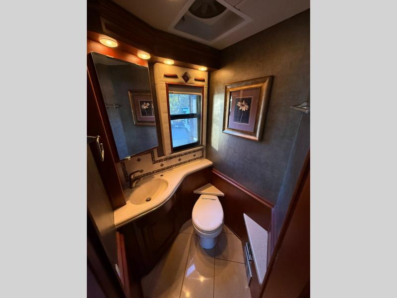 The private master suite includes a residential king bed, generous wardrobe storage, and direct access to the full rear bathroom with a large shower, vanity, and plenty of linen storage. A convenient half bath mid-coach adds comfort for guests and makes travel days easier. Outside, the power awning and exterior entertainment center allow you to enjoy the outdoors rain or shine, while abundant pass-through storage handles all your gear with ease.
