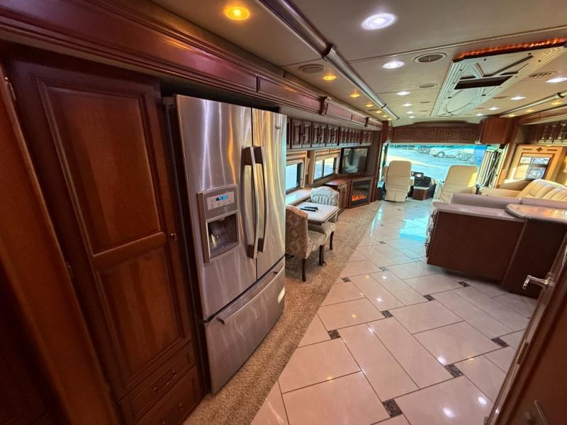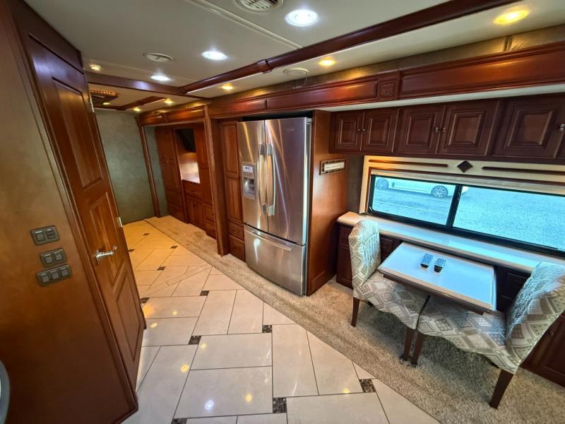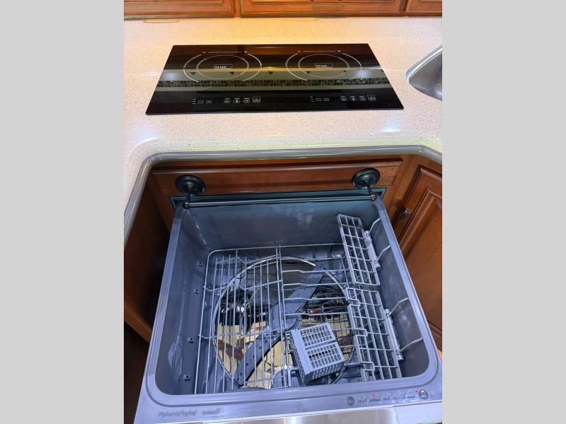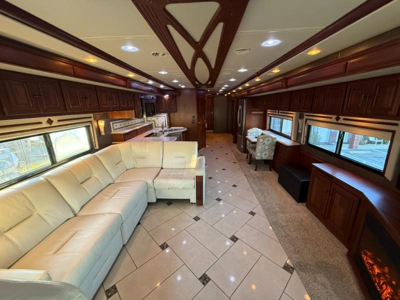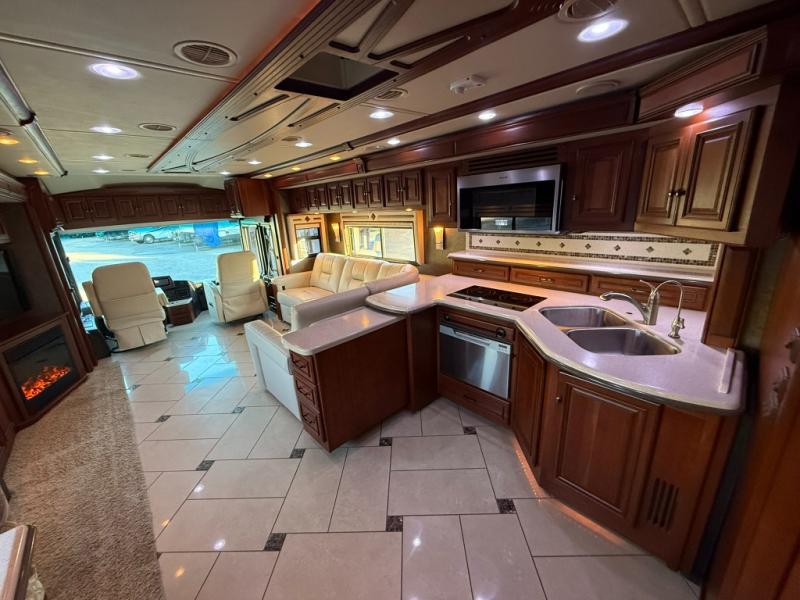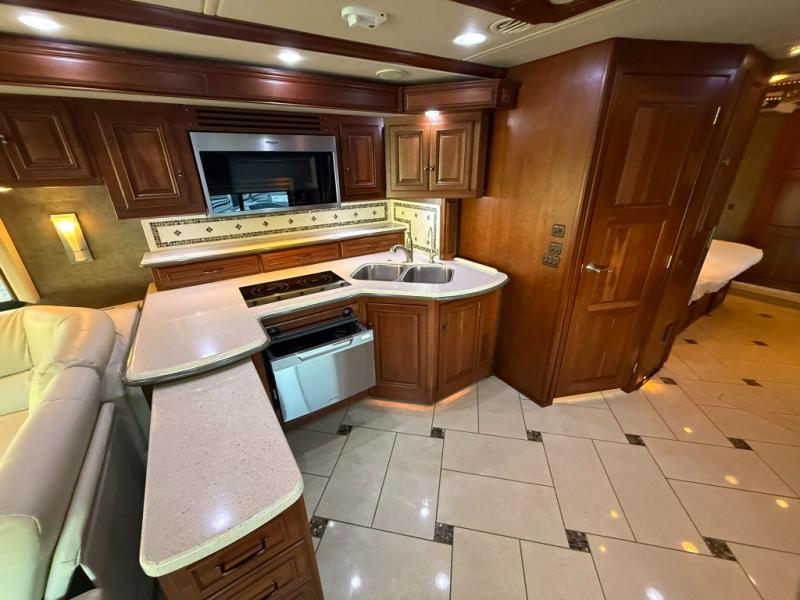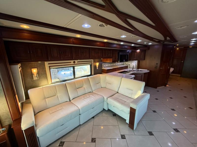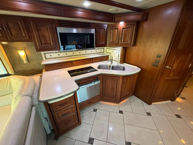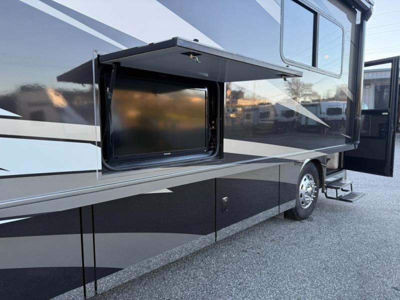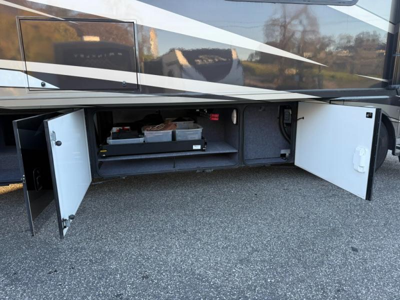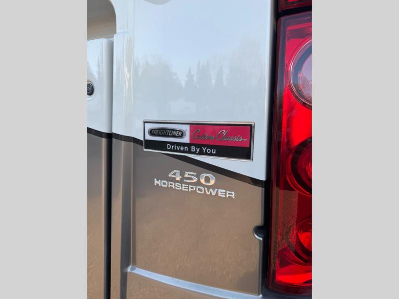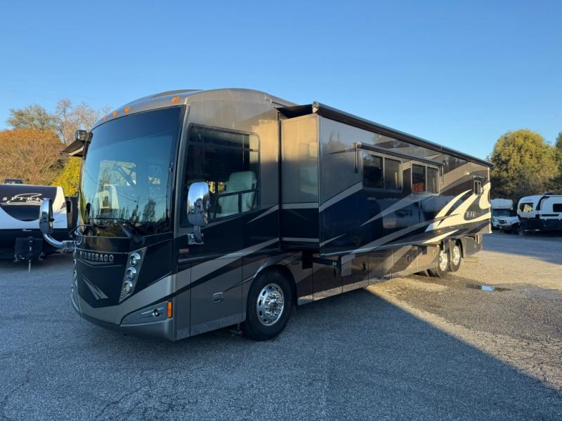 Enjoy true luxury and comfort on the road with this Winnebago Tour 42QD diesel pusher! The spacious quad-slide layout creates a wide-open living space, perfect for extended trips or full-time living. The front living area features plush seating positioned across from the entertainment center, making it easy to relax after a long day of travel. The fully equipped kitchen offers solid-surface countertops, a residential refrigerator, convection microwave, and ample cabinet storage for all your cooking essentials.