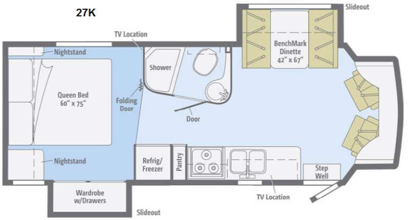 Aspect Class C Motor Home w/Rear Queen Bed w/Nightstands & Wardrobe Slideout, Folding Door Between Bedroom & Living Area, Side Aisle Bath w/Shower, Toilet & Sink, Refrigerator/Freezer/Pantry, 3 Burner Range, Dbl. Kitchen Sink, Counter Space & Overhead Storage, BenchMark Dinette Slideout and Much More! Available Options May Include: Rest Easy Sofa w/Table or Comfort Sofa Sleeper w/Table IPO BenchMark Dinette.